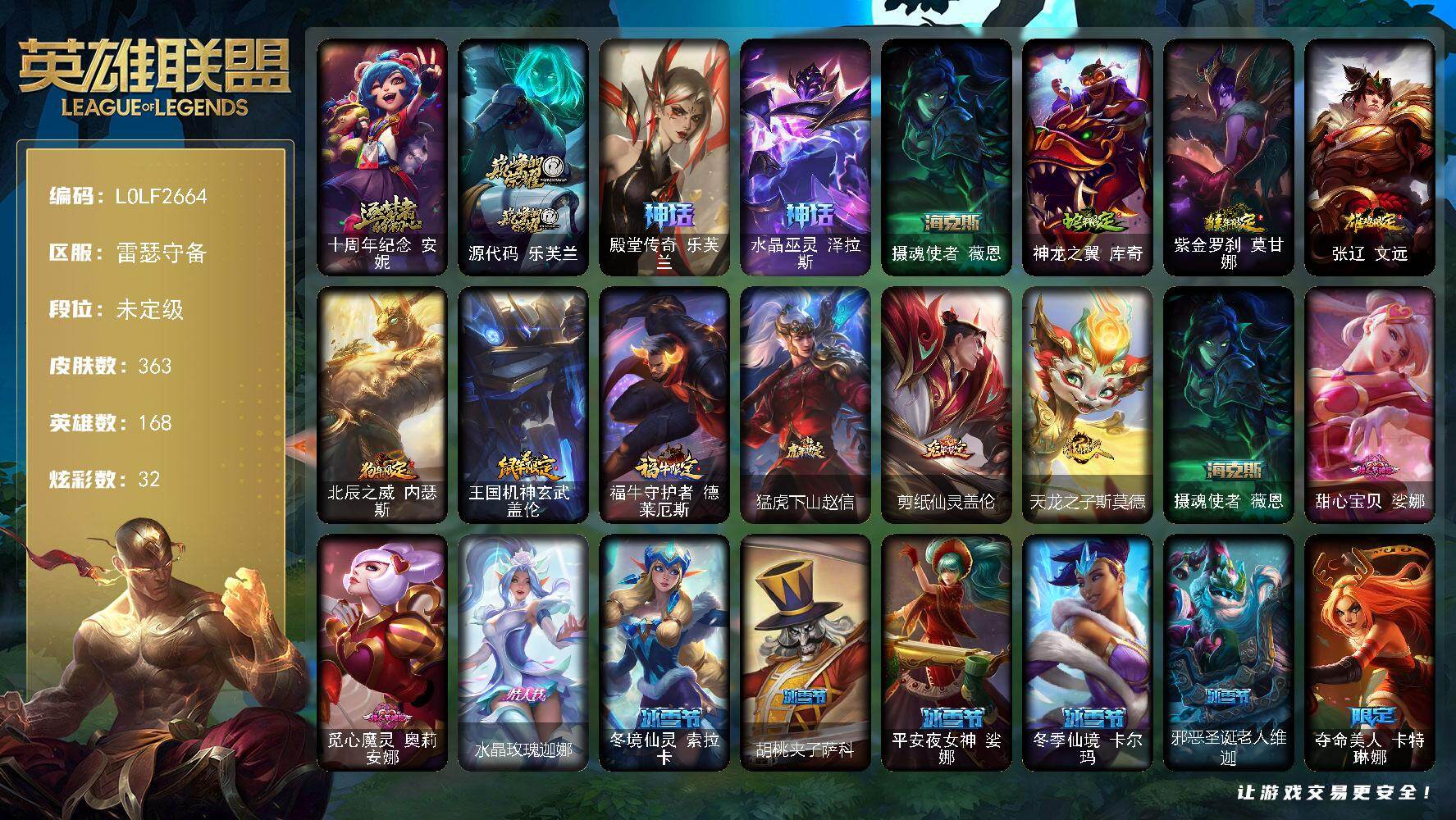 【423775】【LOLF2664】168英雄/363皮肤/1终极/5神话/80限定/8臻彩/32炫彩/49传说/47史诗/未定级账号等级:320/十周年纪念安妮/源代码乐芙兰/殿堂传奇乐芙兰/水晶巫灵泽拉斯/摄魂使者薇恩/春晖神女/无畏骑士瑟庄妮赤子初心/冰雪节格雷福斯炫金/星之守护者卡莎热情之光/星之守护者霞烈羽/幻灵战斗队长厄运小姐勇气赞歌/海之歌艾希冰爽浪花/殿堂传奇乐芙兰登神/神龙之翼