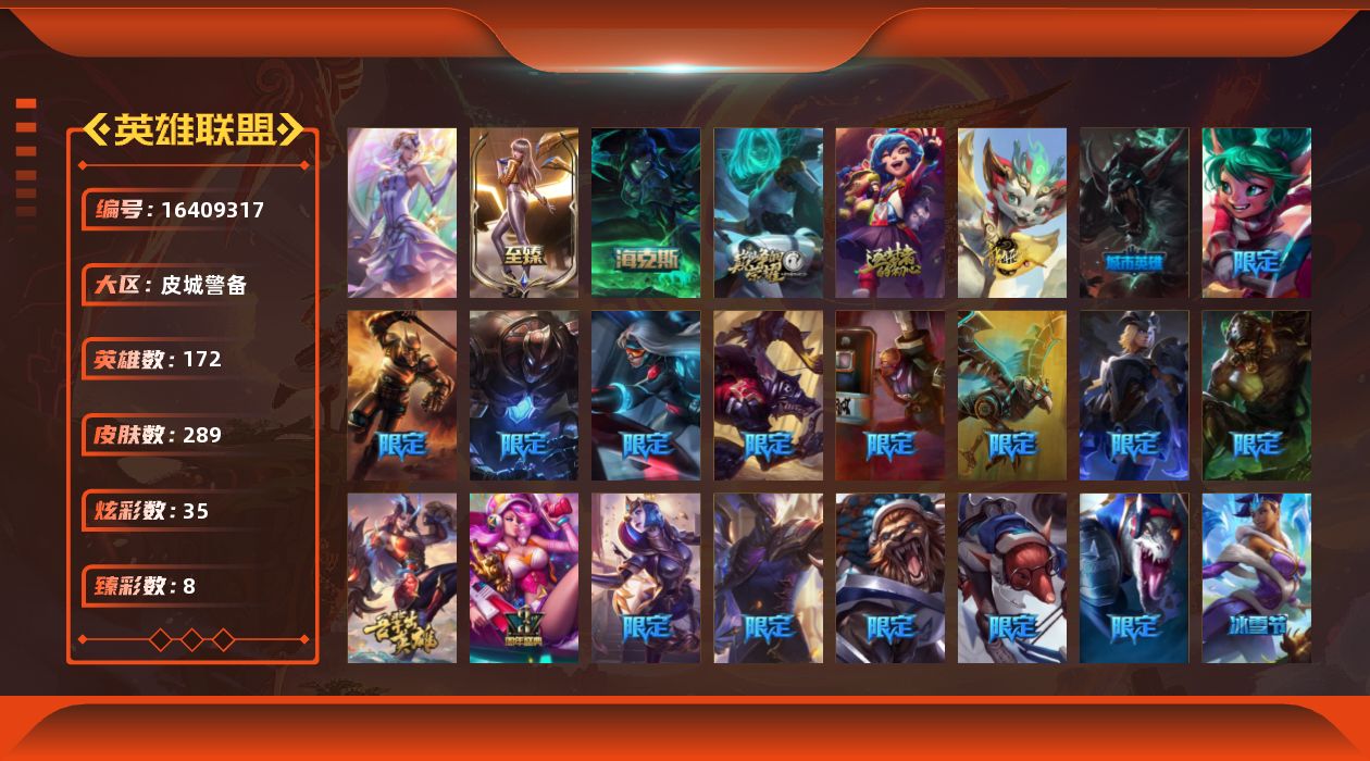 【423867】[16409317]【特价出售/店主推荐】未定级段位-172英雄-289皮肤-35炫彩-1终极-5神话-25限定-22传说-79史诗【至臻皮肤】:至臻KDA卡莎【臻彩皮肤】:无畏骑士瑟庄妮赤子初心,冠军典狱长锤石凯旋圣装,山海绘卷科加斯朱红,玉剑传说苍鸾丁香,可爱可爱粉红红布里茨,魔女阿卡丽虚荣,魔女阿狸饕餮,净雪之月莫甘娜冬虹【年限皮肤】:天龙之子斯莫德【海克斯皮肤】:摄魂使者
