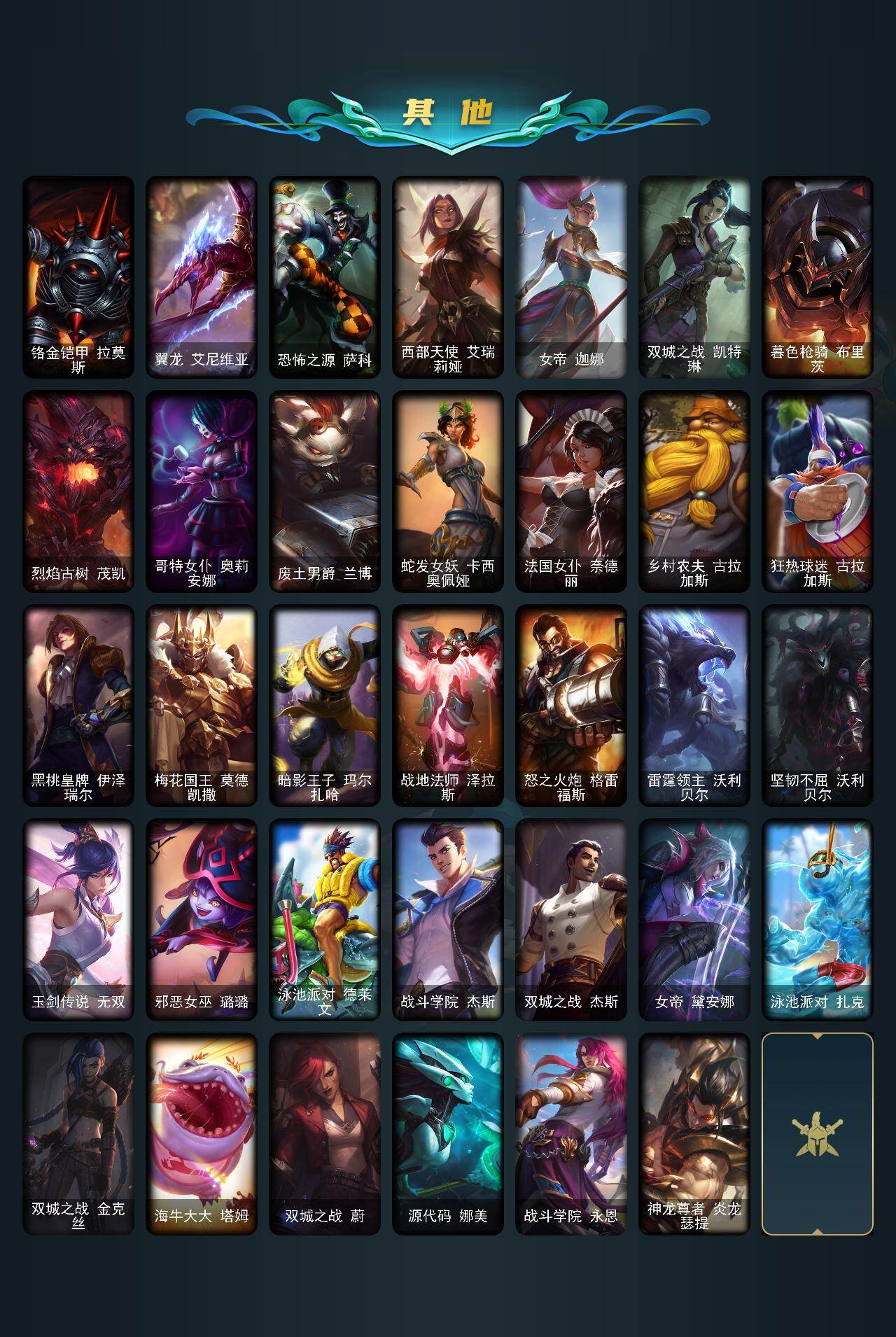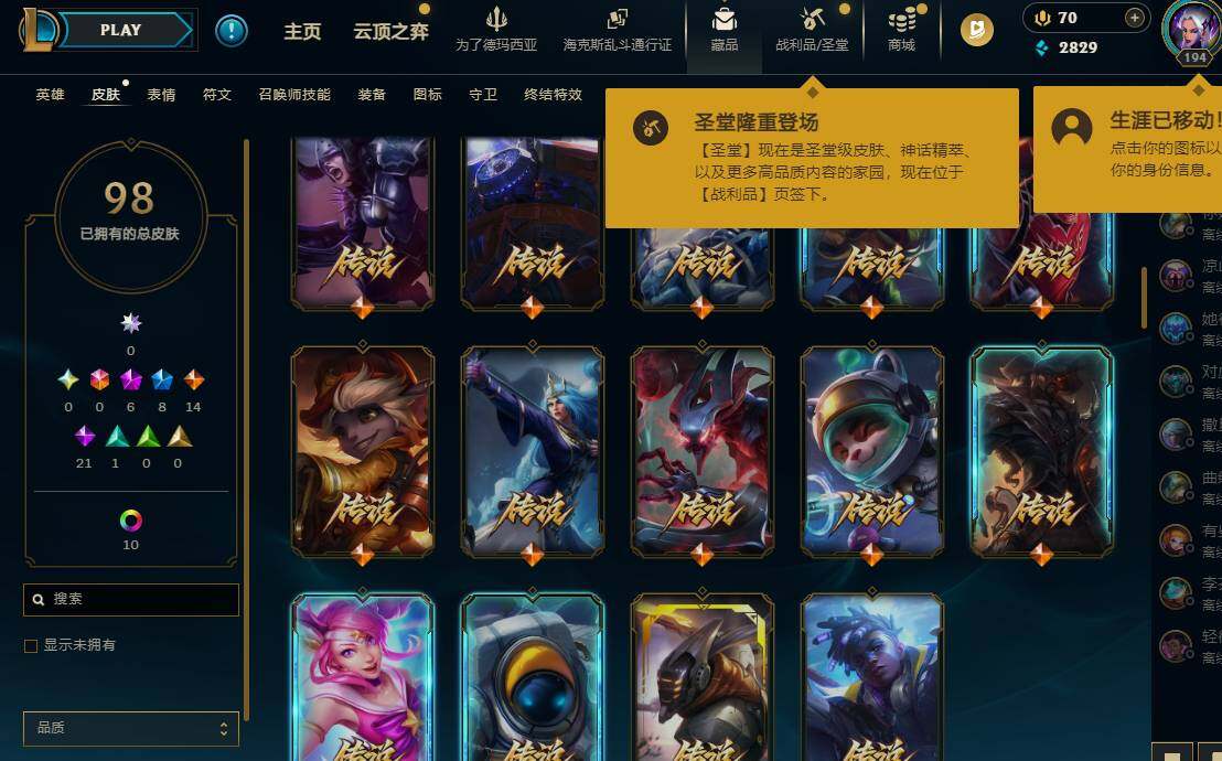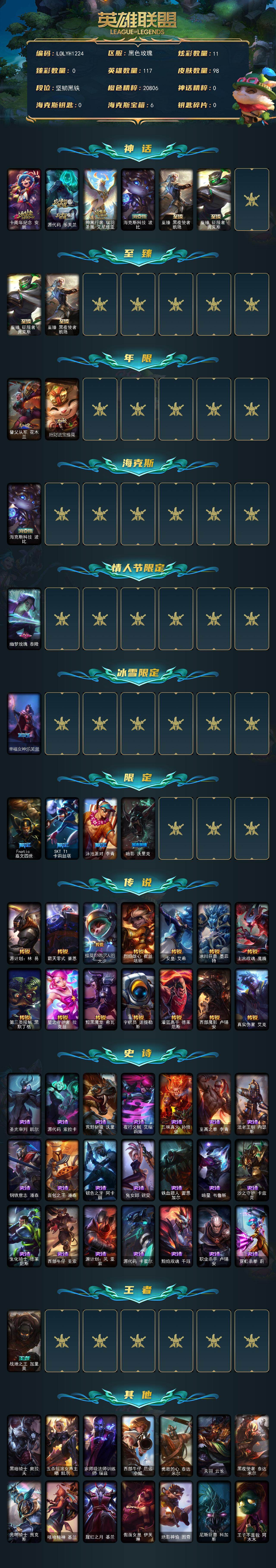 【423994】【LOLYH1224】117英雄/98皮肤/6神话/8限定/11炫彩/14传说/21史诗/未定级/十周年纪念安妮/源代码乐芙兰/神凰行者瑞羽凤凰艾尼维亚/海克斯科技波比/至臻征服者贾克斯/至臻黑夜使者凯隐/替父从军花木兰/招财进宝提莫/幽梦玫瑰泰隆/幸福女神乐芙兰/Fnatic嘉文四世/SKTT1卡莉丝塔/泳池派对李青/暗影妖狐阿狸/源计划:林易/霸天零式赛恩/提莫“约德尔人的一