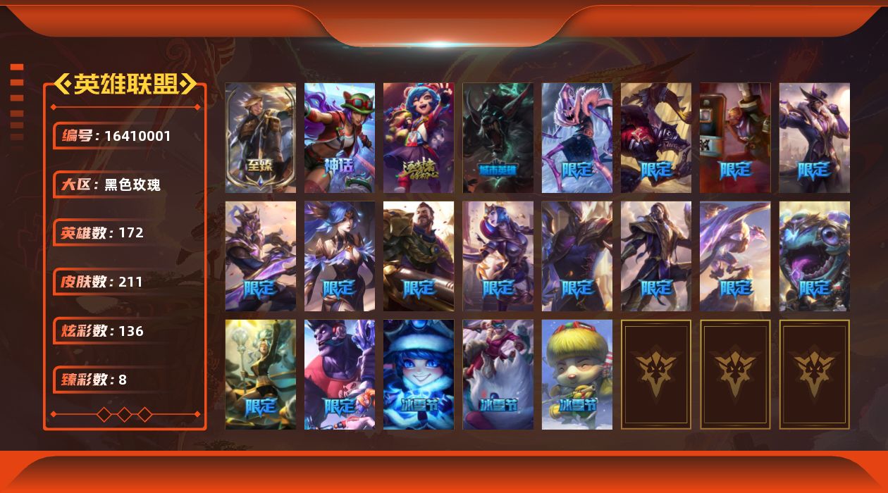 【424029】[16410001]【店主推荐捡漏号】铂金段位-172英雄-211皮肤-136炫彩-0终极-4神话-26限定-19传说-46史诗【神话皮肤】:十周年纪念安妮,十五周年纪念希维尔,神凰行者瑞羽圣凰艾尼维亚,至臻灵能特工伊泽瑞尔【珍稀头像】:至爱的鹿头像【热门头像】:源计划刀妹头像【至臻皮肤】:至臻灵能特工伊泽瑞尔【臻彩皮肤】:无畏骑士瑟庄妮赤子初心,征服者韦鲁斯炫金,冠军之隐劫凯旋
