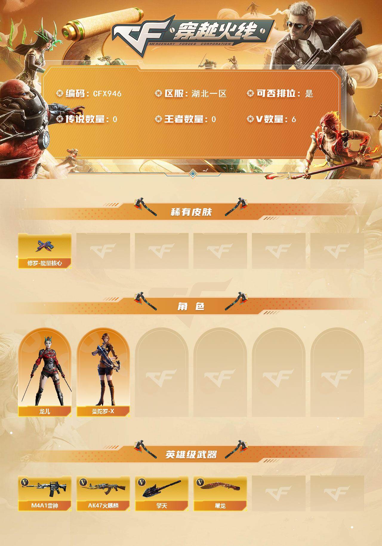 【424117】【424117】【CFX946】6V/95级/将帅/修罗-能量核心/龙儿/曼陀罗-X/AK47-火麒麟/M4A1-雷神/屠龙/擎天/战舰背包/