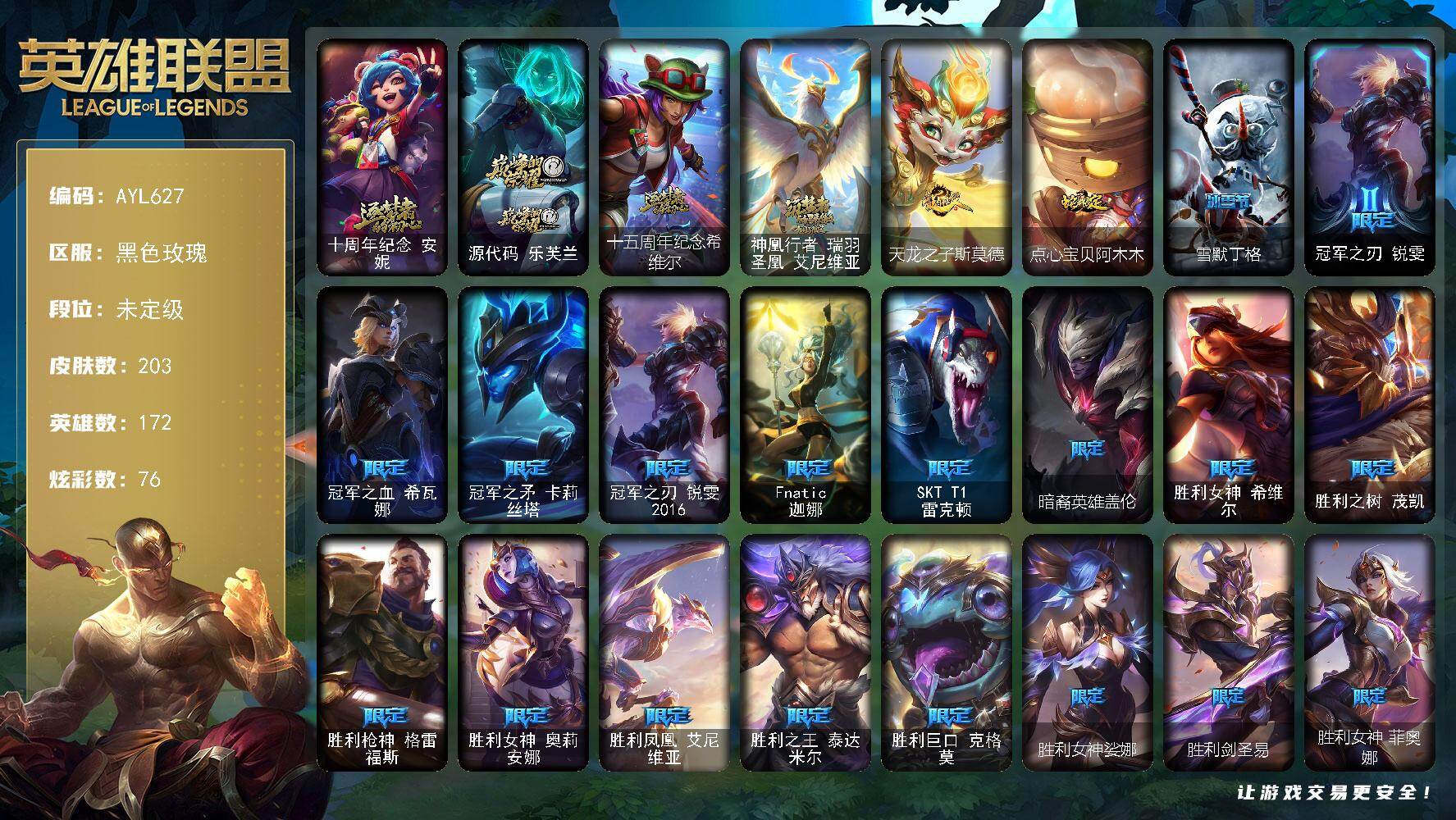 【424155】[16410424]【店主推荐捡漏号】未定级段位-172英雄-203皮肤-76炫彩-0终极-4神话-29限定-16传说-48史诗【神话皮肤】:十周年纪念安妮,源代码乐芙兰,十五周年纪念希维尔,神凰行者瑞羽圣凰艾尼维亚【珍稀头像】:雪花头像【臻彩皮肤】:冠军之刃锐雯2016凯旋圣装,霸天战士雷恩加尔星啸天火,星之守护者辛德拉未来之光,玉剑传说琴仙子丁香,星之守护者霞烈羽,魔女阿卡丽