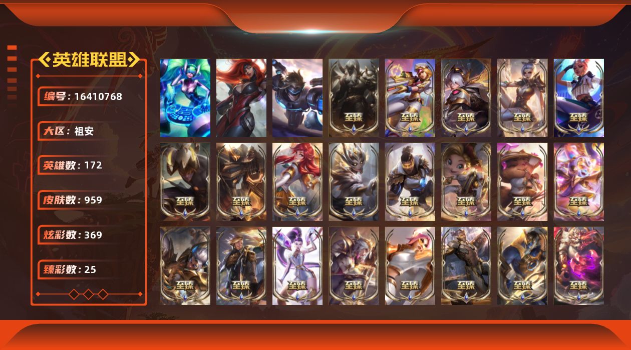 【424162】[16410768]【特价出售/店主推荐】未定级段位-172英雄-959皮肤-369炫彩-3终极-42神话-161限定-84传说-213史诗【神话皮肤】:十周年纪念安妮,源代码乐芙兰,新卧虎藏龙贾克斯,海克斯科技阿利斯塔,海克斯科技安妮,海克斯科技克格莫,海克斯科技雷克顿,恐惧新星德莱厄斯,新创战纪希维尔,至臻真实伤害奇亚娜,至臻真实伤害奇亚娜2022,至臻奥术师佐伊,至臻电玩女