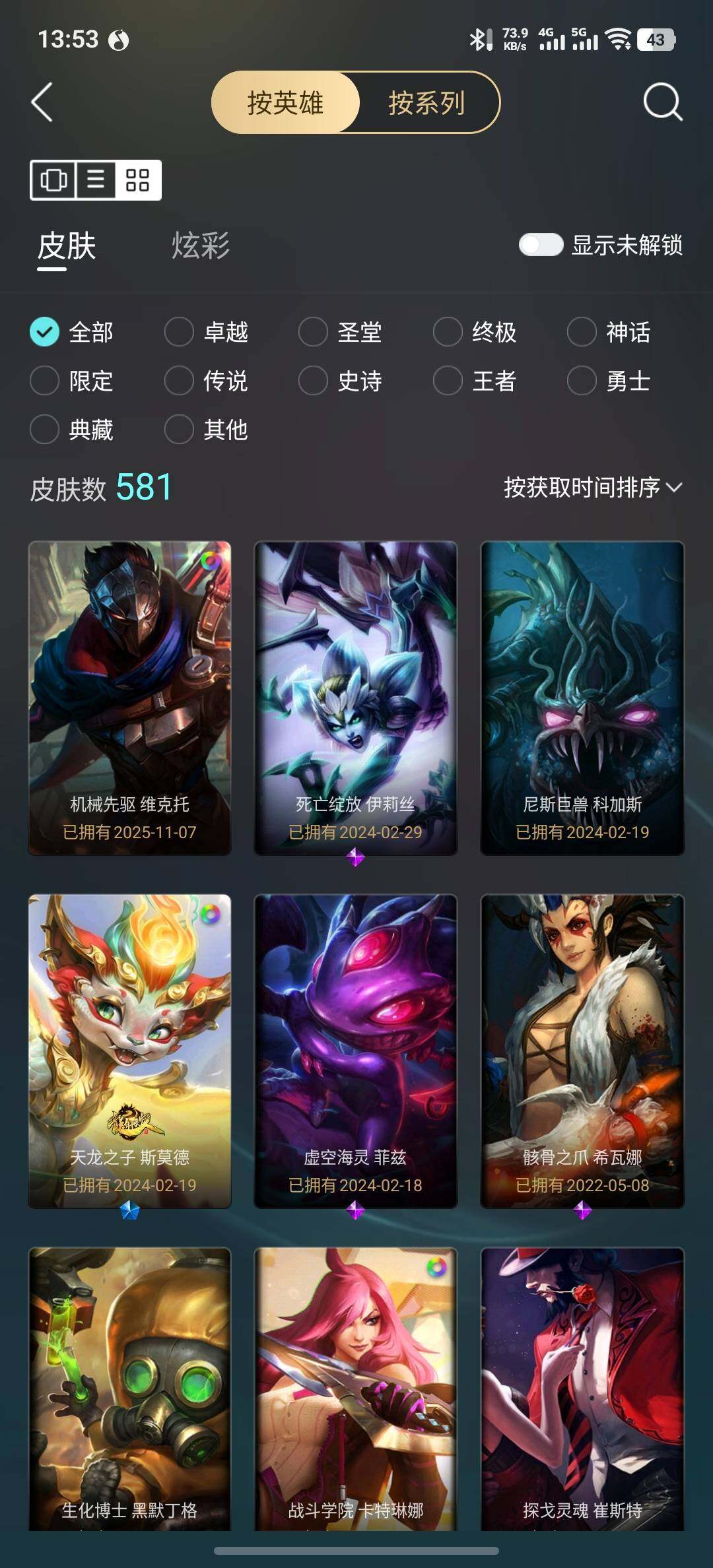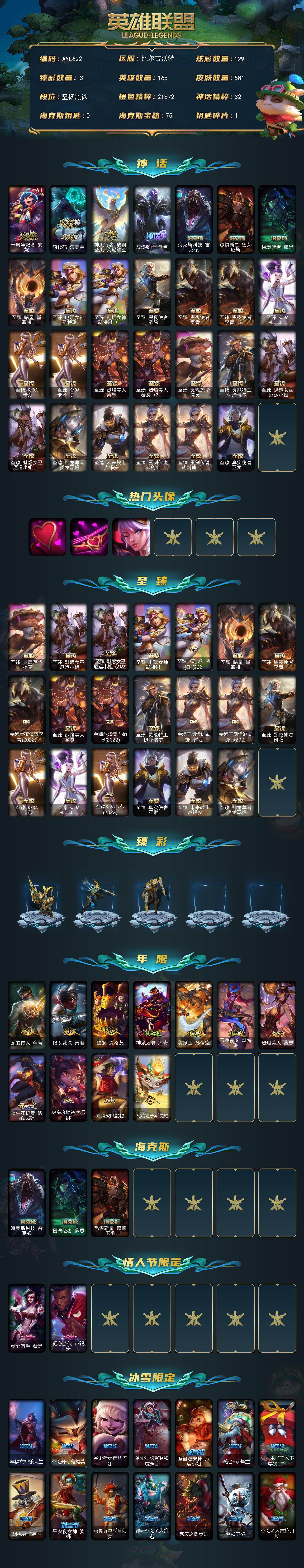 【424349】[16411699]【店主推荐捡漏号】未定级段位-165英雄-581皮肤-129炫彩-2终极-27神话-108限定-61传说-148史诗【神话皮肤】:十周年纪念安妮,源代码乐芙兰,神凰行者瑞羽圣凰艾尼维亚,灰烬骑士派克,海克斯科技雷克顿,恐惧新星德莱厄斯,摄魂使者薇恩,至臻真实伤害亚索,至臻暗星墨菲特,至臻电玩女神凯特琳,至臻电玩女神凯特琳2022,至臻黑夜使者凯隐,至臻黑夜使者