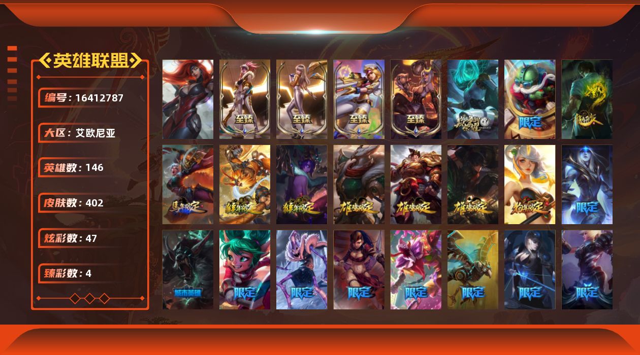 【424503】[16412787]【店主推荐捡漏号】铂金段位-146英雄-402皮肤-47炫彩-1终极-5神话-64限定-35传说-99史诗【热门头像】:爱情之歌头像【至臻皮肤】:至臻电玩女神凯特琳,至臻烈焰美人薇恩,至臻KDA阿卡丽,至臻KDA卡莎【臻彩皮肤】:龙的传人李青跃龙在渊,玉净夜叉凯特琳炫金神机,冠军之刃锐雯2016凯旋圣装【年限皮肤】:龙的传人李青,碧玉之牙卡西奥佩娅,替父从军花