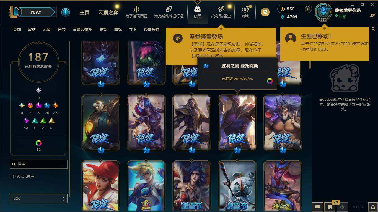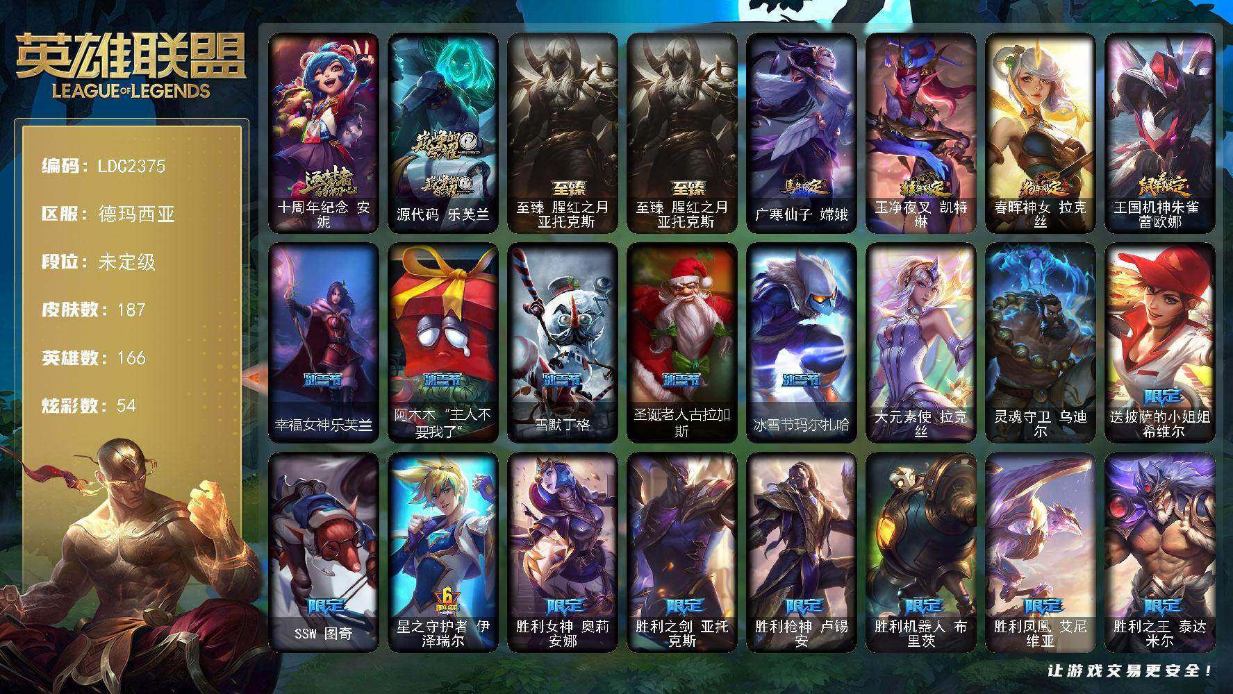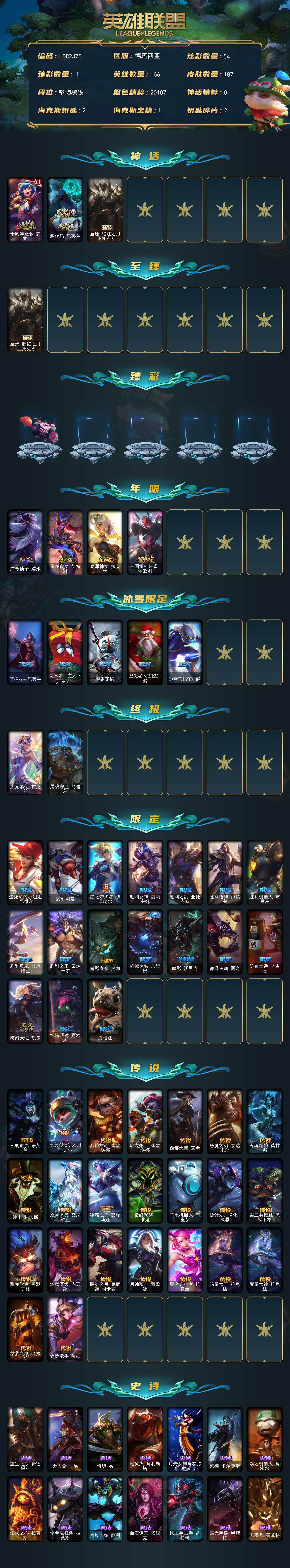 【424547】【LDC2375】166英雄/187皮肤/2终极/3神话/26限定/1臻彩/54炫彩/23传说/43史诗/未定级/十周年纪念安妮/源代码乐芙兰/至臻腥红之月亚托克斯/可爱可爱粉红红布里茨/广寒仙子嫦娥/玉净夜叉凯特琳/春晖神女拉克丝/王国机神朱雀蕾欧娜/幸福女神乐芙兰/阿木木:“主人不要我了”/雪默丁格/圣诞老人古拉加斯/冰雪节玛尔扎哈/大元素使拉克丝/灵魂守卫乌迪尔/送披萨的小