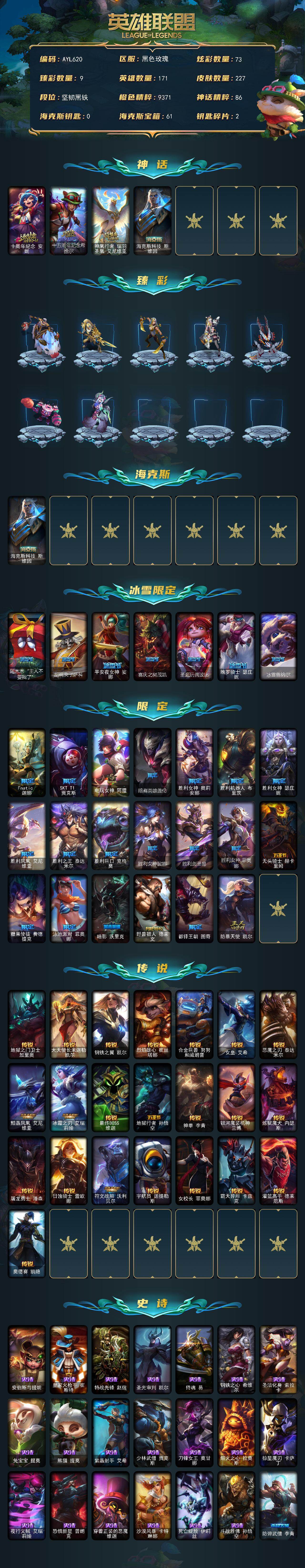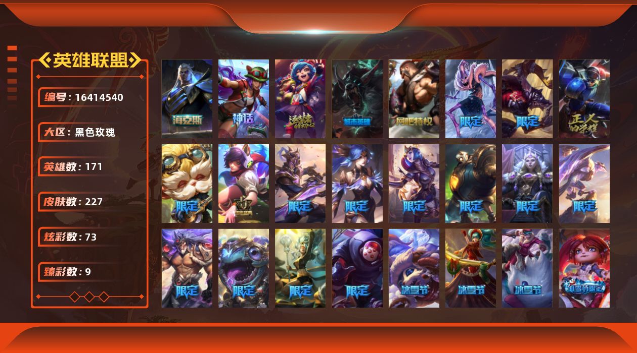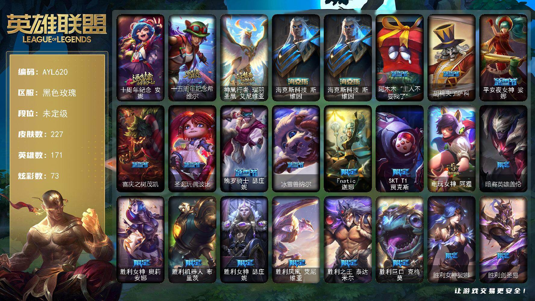 【424564】[16414540]【店主推荐捡漏号】未定级段位-171英雄-227皮肤-73炫彩-0终极-4神话-28限定-22传说-48史诗【神话皮肤】:十周年纪念安妮,十五周年纪念希维尔,神凰行者瑞羽圣凰艾尼维亚,海克斯科技斯维因【臻彩皮肤】:无畏骑士瑟庄妮赤子初心,赵云子龙炫金将军,闭月之颜貂蝉炫金莲华,咖啡甜心金克丝核桃巴菲,霸天异形卡兹克刹那银光,可爱可爱粉红红布里茨,魔女阿卡丽虚荣