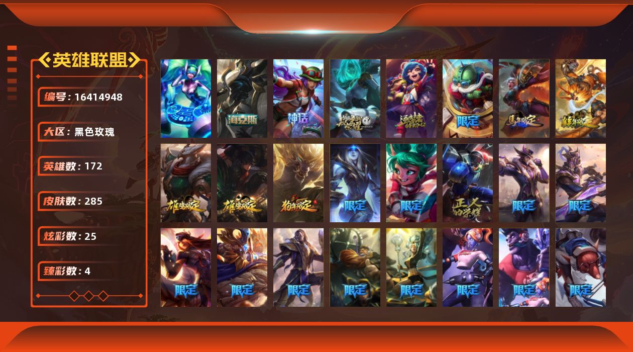 【424595】[16414948]【店主推荐捡漏号】黄金段位-172英雄-285皮肤-25炫彩-1终极-4神话-32限定-22传说-75史诗【臻彩皮肤】:无畏骑士瑟庄妮赤子初心,源计划火菲奥娜惩戒,魔女阿卡丽虚荣,净雪之月莫甘娜冬虹【年限皮肤】:替父从军花木兰,美猴王孙悟空,司马懿仲达,虎痴之拳蔚,南天之怒沃里克【海克斯皮肤】:零之枪骑赫卡里姆【情人节限定】:觅心游侠卢锡安【冰雪限定】:圣诞开