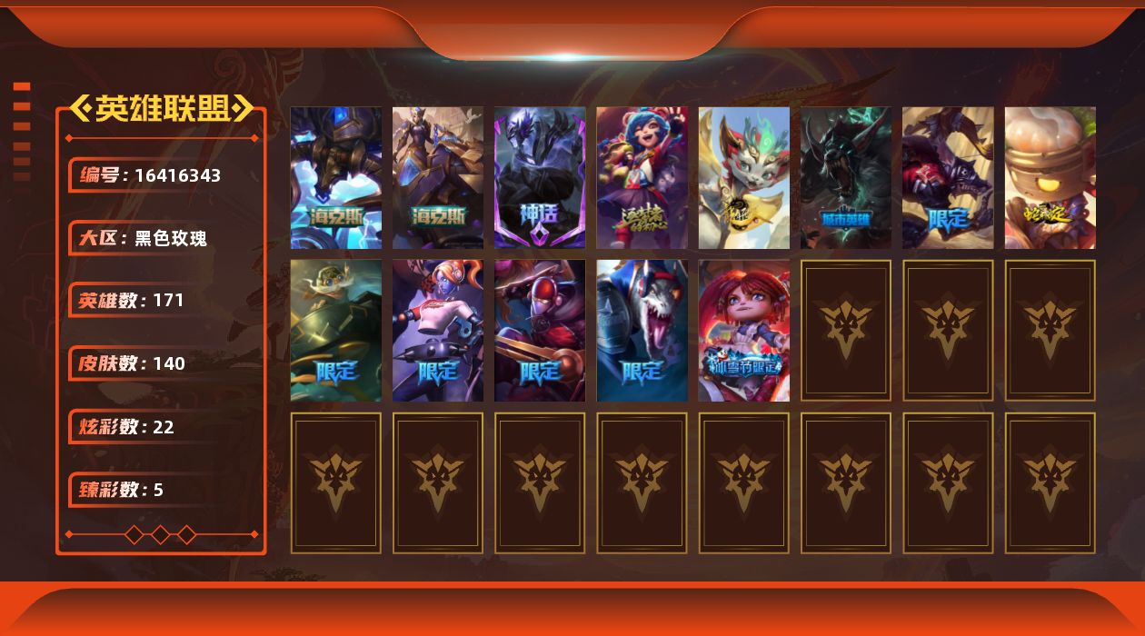 【424674】[16416343]白银段位-171英雄-140皮肤-22炫彩-0终极-5神话-15限定-19传说-30史诗【臻彩皮肤】:无畏骑士瑟庄妮赤子初心,霸天异形卡兹克掠空魅影,战斗学院卡特琳娜盛典礼服,魔女阿卡丽虚荣,霸天异形卡兹克丛林灾厄【年限皮肤】:天龙之子斯莫德,点心宝贝阿木木【海克斯皮肤】:海克斯科技阿利斯塔,海克斯科技瑟庄妮【冰雪限定】:圣诞狂欢基兰,圣诞玩偶波比【神话皮肤】