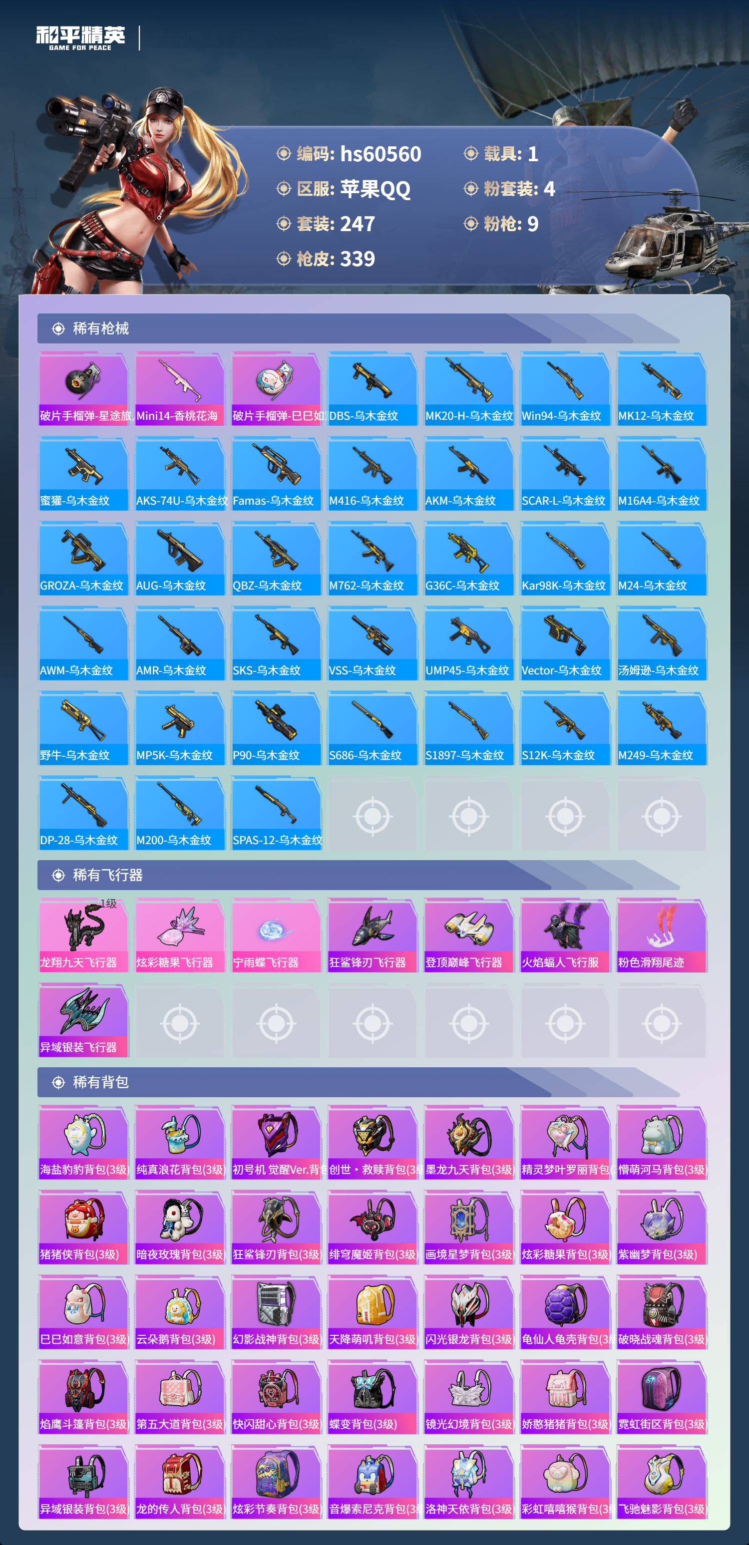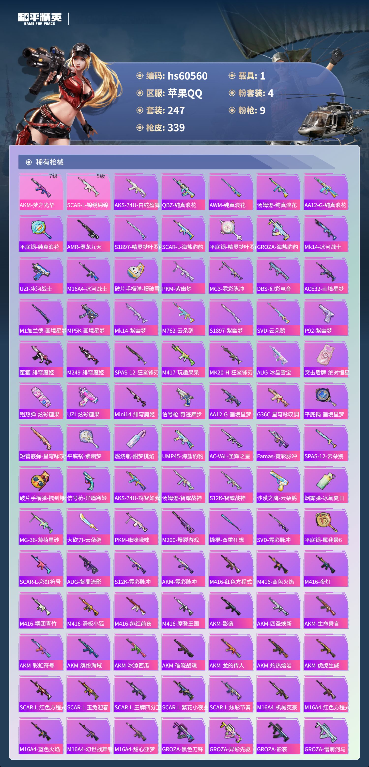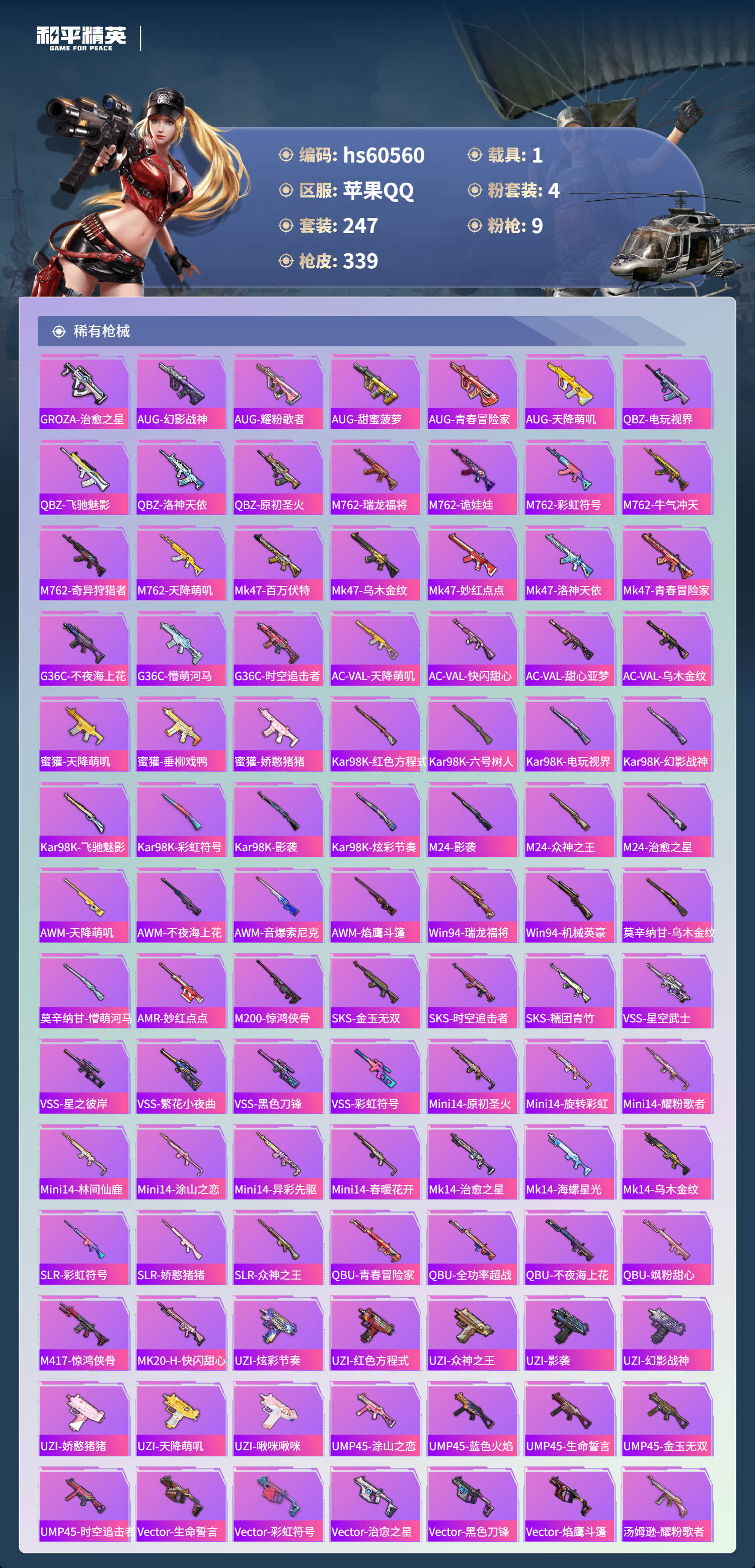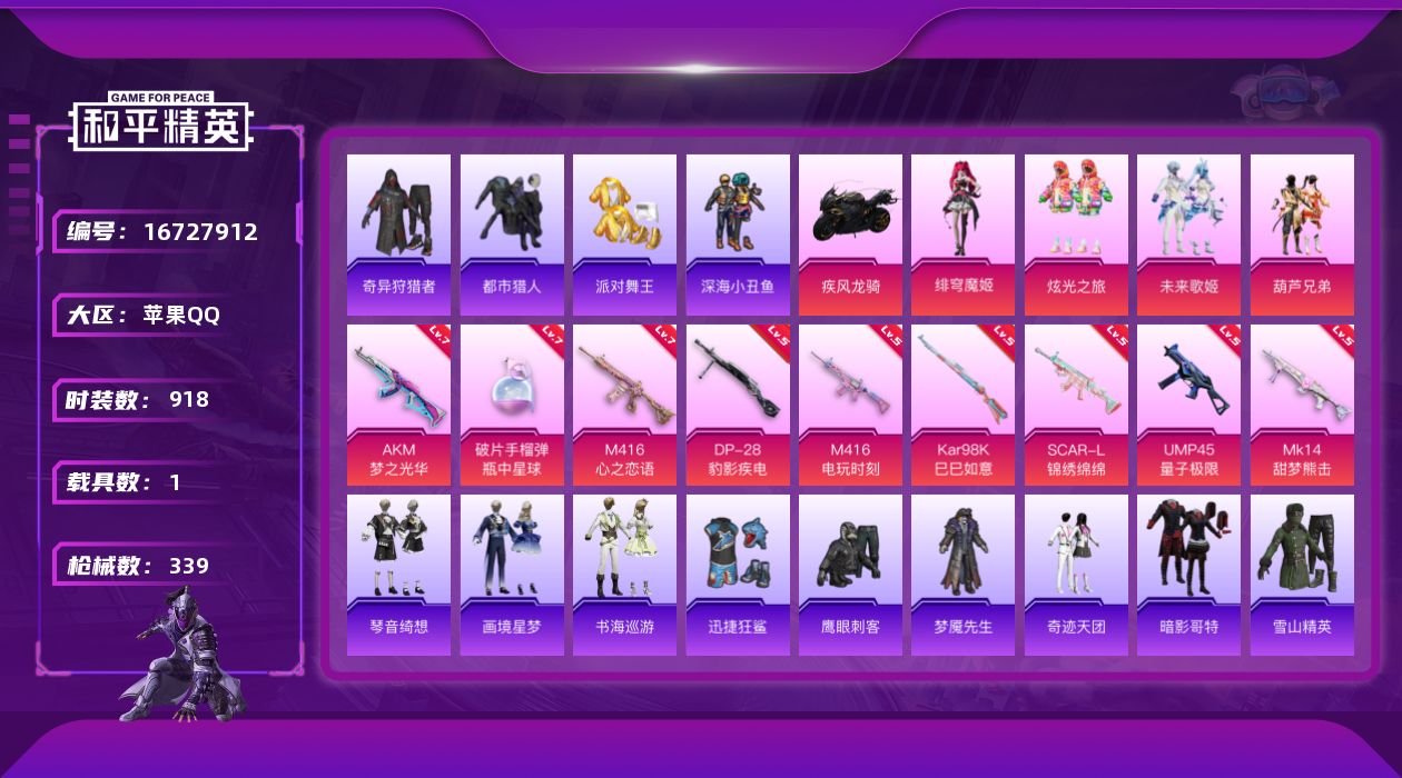 【465291】【不可二次】【苹果QQ】龟仙人 水银刺客 漫步者 都市猎人 机械英豪 极速红龙 葫芦兄弟 梦起落英 M762-奇异狩猎者 M416-电玩时刻 Mini14-林间仙鹿 UMP45-量子极限 M416-心之恋语 深海小丑鱼 瑞龙福将 团圆交子 迅捷狂鲨 奇异狩猎者 M762-瑞龙福将 黑色刀锋 新侠客行 龙翔九天飞行器 金羽特工 SCAR-L-锦绣绵绵 AKM-梦之光华 AKM-缤纷