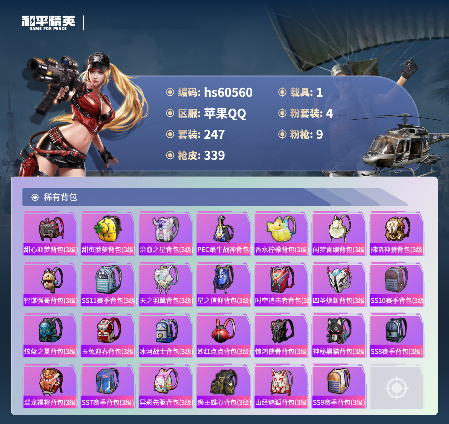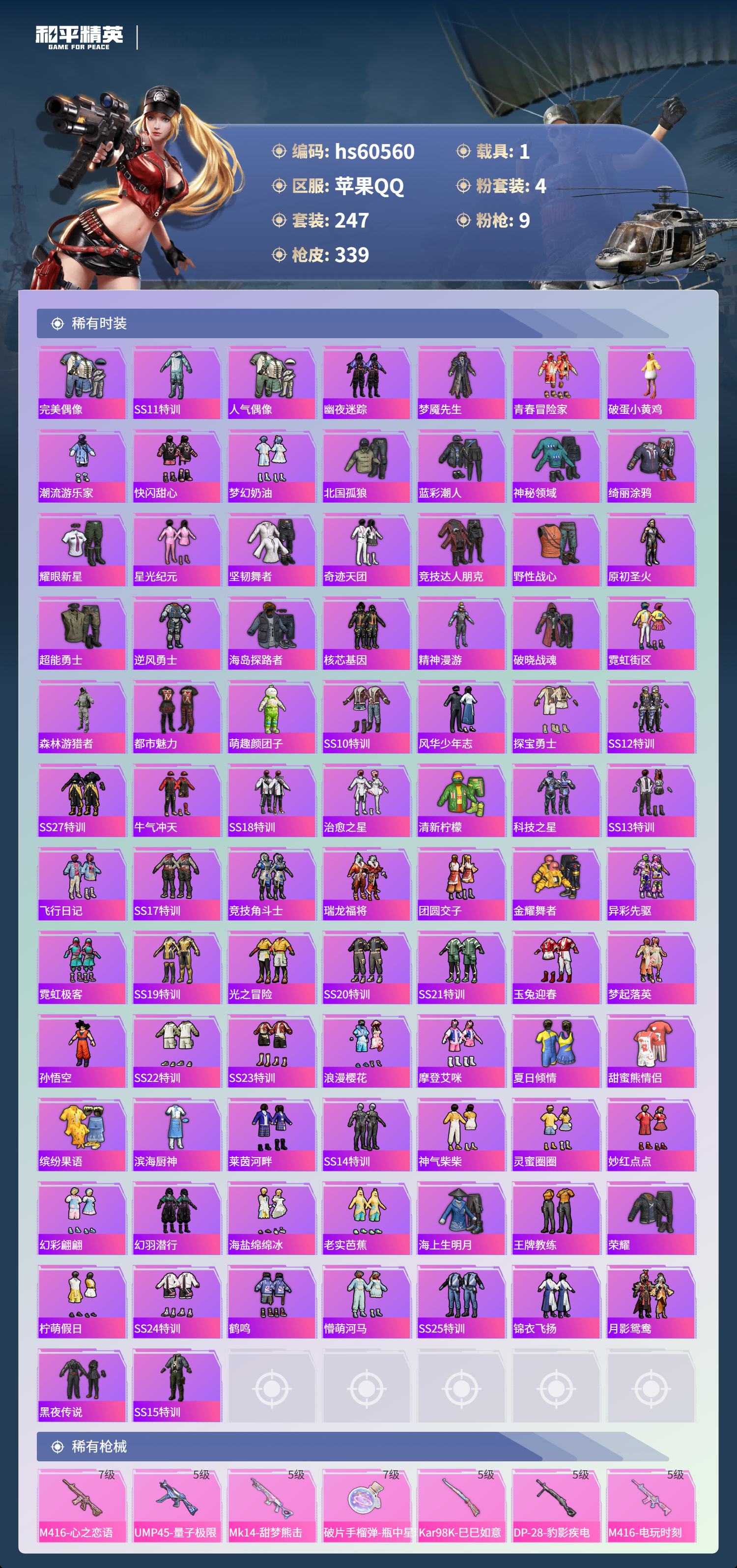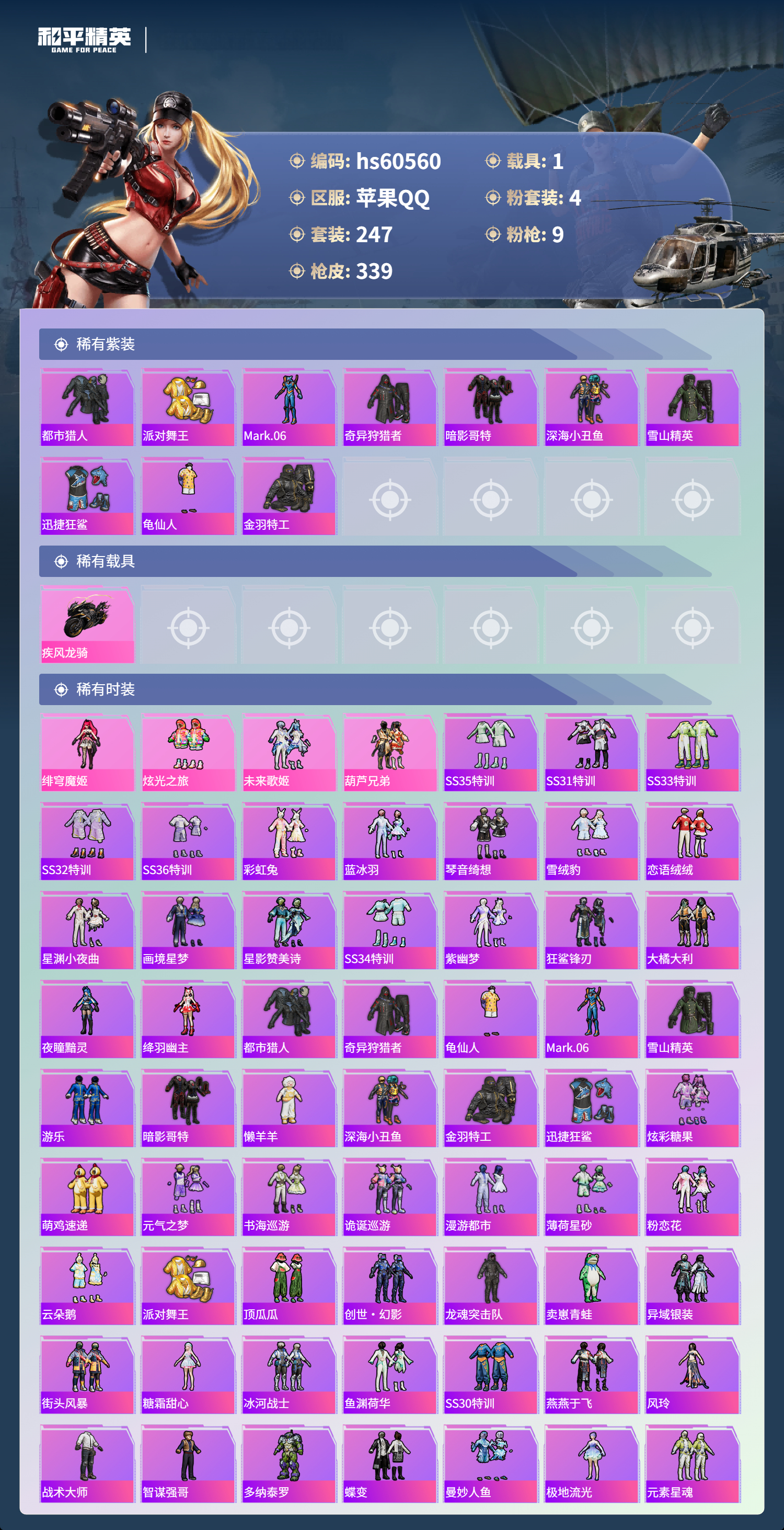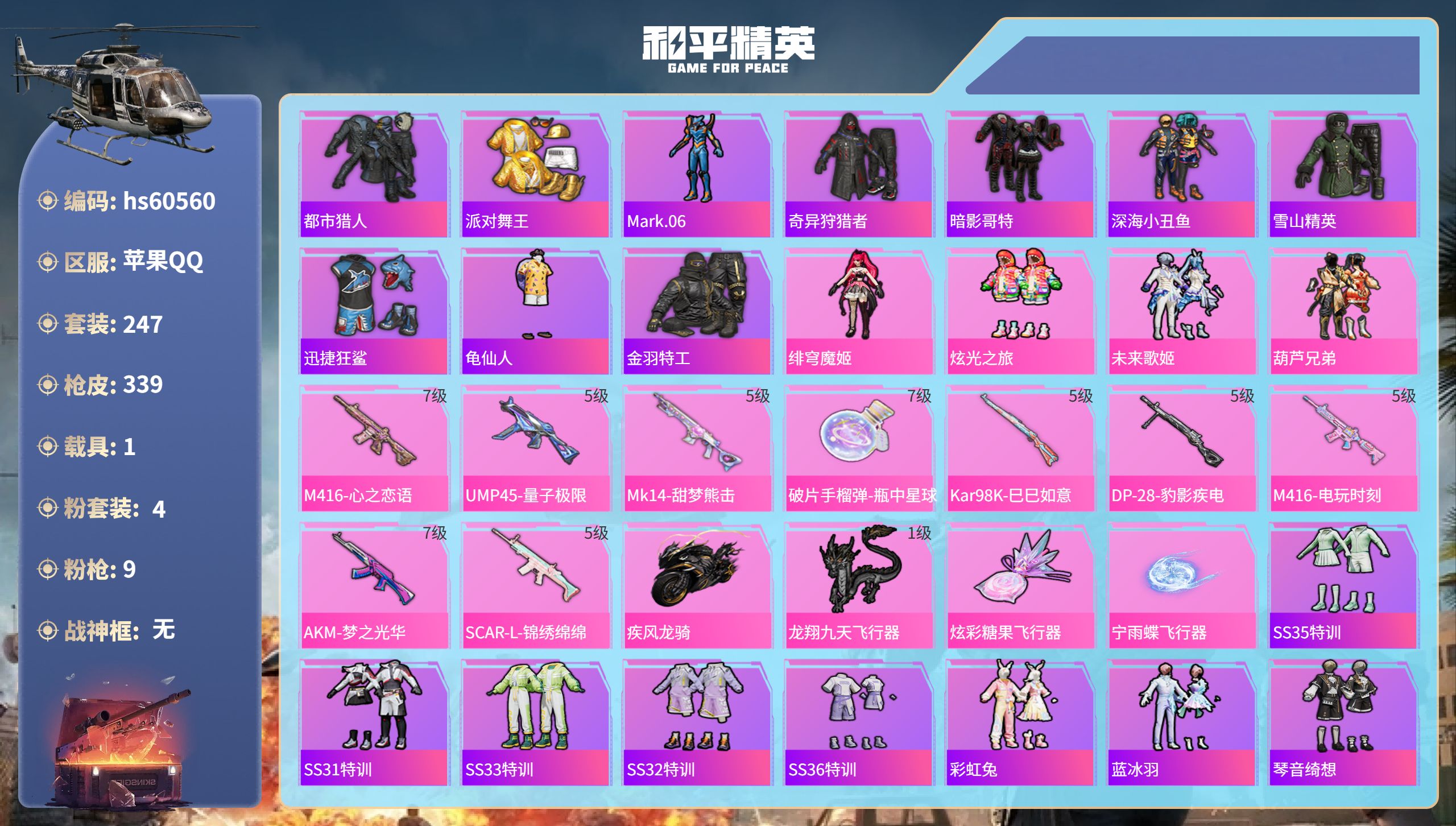 【465291】【不可二次】【苹果QQ】龟仙人 水银刺客 漫步者 都市猎人 机械英豪 极速红龙 葫芦兄弟 梦起落英 M762-奇异狩猎者 M416-电玩时刻 Mini14-林间仙鹿 UMP45-量子极限 M416-心之恋语 深海小丑鱼 瑞龙福将 团圆交子 迅捷狂鲨 奇异狩猎者 M762-瑞龙福将 黑色刀锋 新侠客行 龙翔九天飞行器 金羽特工 SCAR-L-锦绣绵绵 AKM-梦之光华 AKM-缤纷