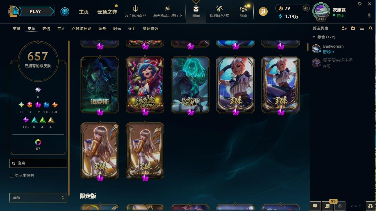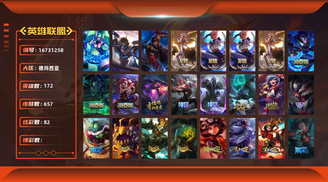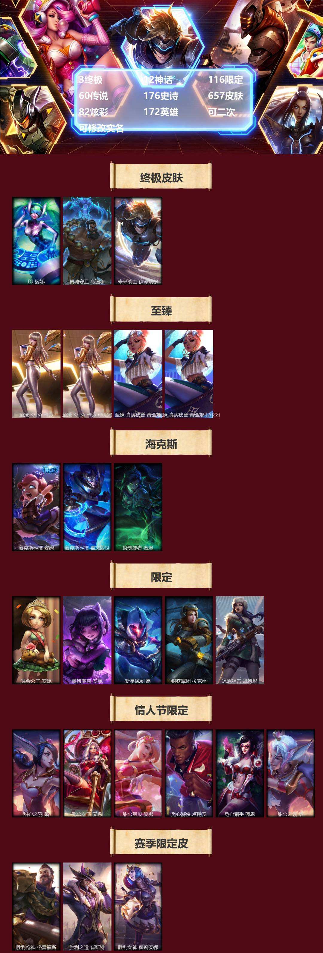 【465667】[16731258]3终极 12神话 116限定 60传说 176史诗 657皮肤 82炫彩 172英雄 可二次 可修改实名 【至臻】至臻 K/DA 卡莎(2022),至臻 真实伤害 奇亚娜(2022),至臻 K/DA 卡莎,至臻 真实伤害 奇亚娜【海克斯】海克斯 嘉文四世,摄魂 薇恩,海克斯 安妮【限定】冰原狙击 凯特琳,钢铁军团 拉克丝,斩星魔剑 易,舞会公主 安妮,哥特萝莉