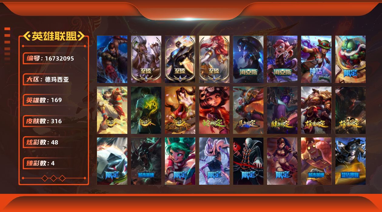 【465726】[16732095]【特价出售/店主推荐】黄金段位-169英雄-316皮肤-48炫彩-1终极-6神话-82限定-24传说-68史诗【至臻皮肤】:至臻魅惑女巫厄运小姐,至臻战斗学院拉克丝,至臻未来战士锤石【臻彩皮肤】:天龙之子卡莎飞龙乘云,无畏骑士瑟庄妮赤子初心,魔女阿卡丽虚荣,净雪之月莫甘娜冬虹【年限皮肤】:龙的传人李青,古琴余韵娑娜,定海神珍孙悟空,你看见过我的熊猫吗安妮,替父