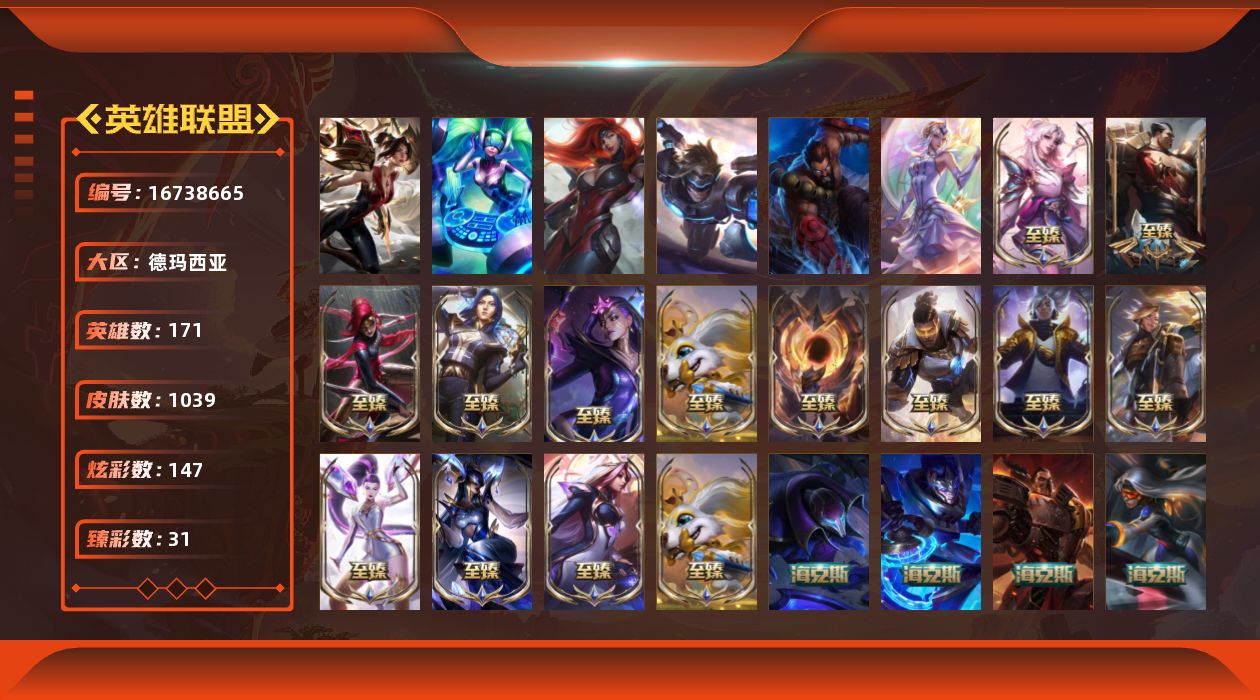 【466155】[16738665]未定级段位-171英雄-1039皮肤-147炫彩-5终极-34神话-169限定-87传说-196史诗【神话皮肤】:十周年纪念安妮,十五周年纪念希维尔,暗星科加斯,殿堂传奇薇恩,灰烬杀手塞拉斯,海克斯科技阿利斯塔,海克斯科技阿木木,海克斯科技安妮,海克斯科技波比,海克斯科技嘉文四世,海克斯科技拉莫斯,海克斯科技雷克顿,海克斯科技玛尔扎哈,海克斯科技魔腾,海克斯科