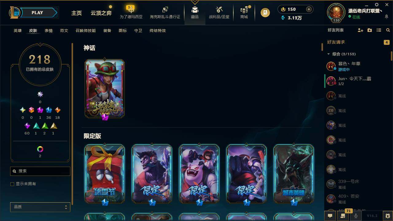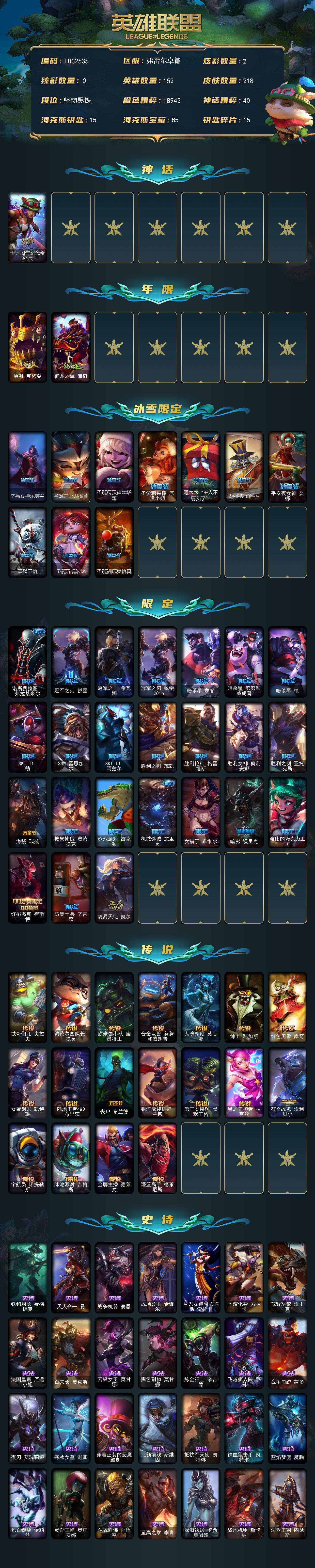 【470673】【LDC2535】152英雄/218皮肤/1神话/36限定/2炫彩/18传说/60史诗/未定级/十五周年纪念希维尔/醒狮克格莫/神龙之翼库奇/幸福女神乐芙兰/圣诞开心鬼提莫/圣诞精灵崔丝塔娜/圣诞糖果棒厄运小姐/阿木木:“主人不要我了”/胡桃夹子萨科/平安夜女神娑娜/雪默丁格/圣诞玩偶波比/圣诞驯鹿克格莫/诺斯费拉图费拉基米尔/冠军之刃锐雯/冠军之血希瓦娜/冠军之刃锐雯2018/