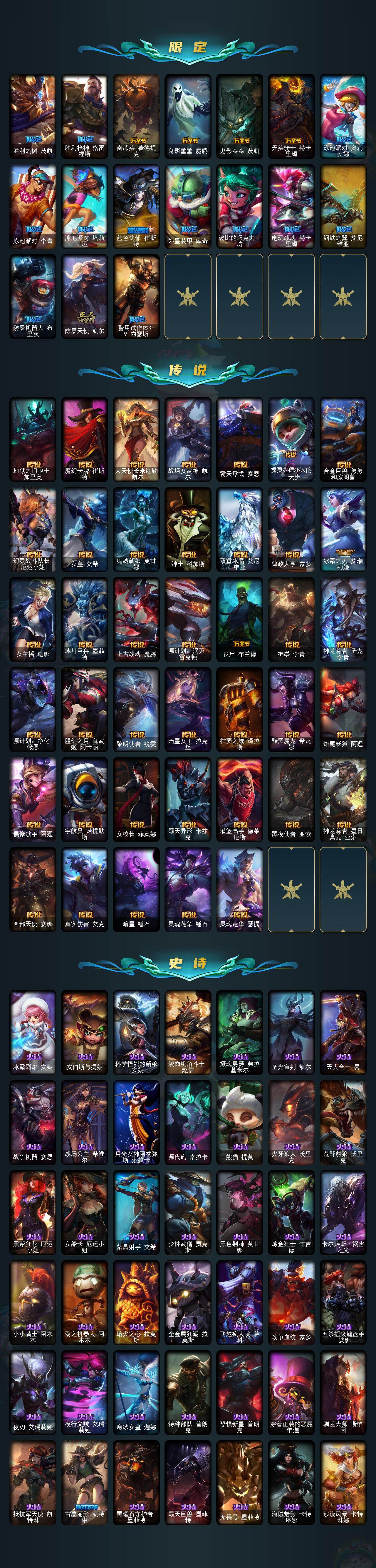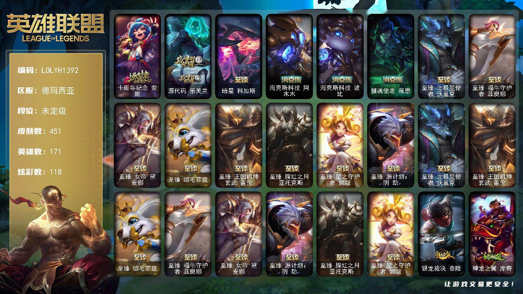 【471083】【LOLYH1392】171英雄/451皮肤/14神话/63限定/9臻彩/118炫彩/40传说/113史诗/未定级/十周年纪念安妮/源代码乐芙兰/暗星科加斯/海克斯科技阿木木/海克斯科技波比/摄魂使者薇恩/至臻北极星使者沃里克/至臻福牛守护者菲奥娜/至臻女帝黛安娜/至臻绒毛菲兹/至臻王国机神玄武盖伦/至臻腥红之月亚托克斯/至臻星之守护者妮蔻/至臻源计划:阴劫/雪花/至爱的鹿/至臻