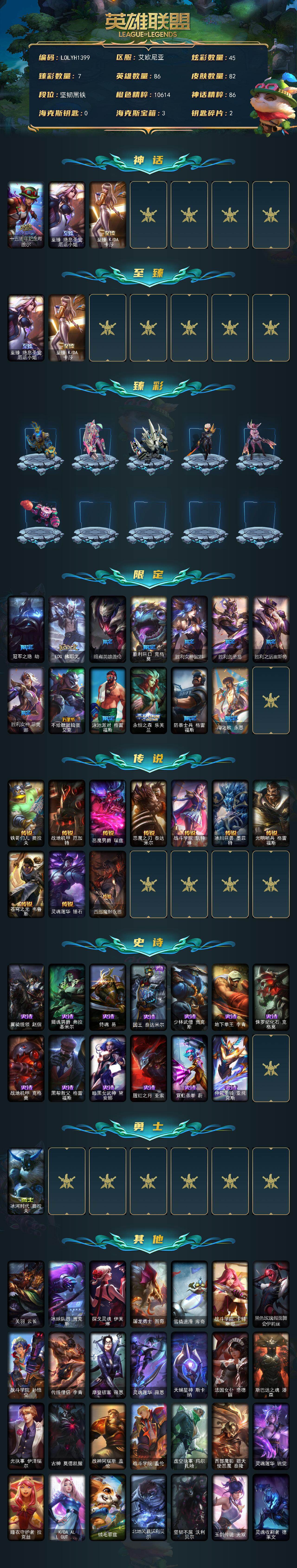 【471121】【LOLYH1399】86英雄/82皮肤/3神话/13限定/7臻彩/45炫彩/10传说/13史诗/未定级/十五周年纪念希维尔/至臻绝息圣堂厄运小姐/至臻K/DA卡莎/冠军典狱长锤石凯旋圣装/幻灵战斗猫金克丝梦幻强袭/霸天巨兽雪崩墨菲特/源计划火菲奥娜惩戒/破败军团厄运小姐灵岛征伐使/可爱可爱粉红红布里茨/星之守护者阿卡丽热情之光/冠军之隐劫/EDG佛耶戈/暗裔英雄盖伦/胜利巨口克