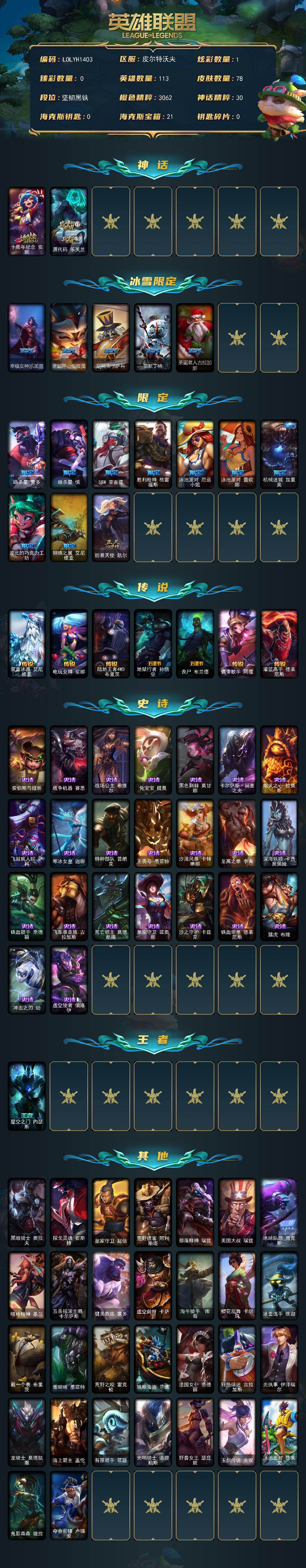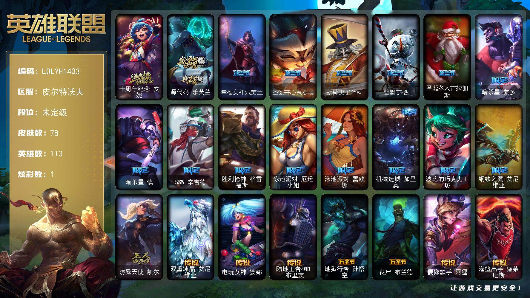 【471135】【LOLYH1403】113英雄/78皮肤/2神话/15限定/1炫彩/7传说/23史诗/未定级/十周年纪念安妮/源代码乐芙兰/幸福女神乐芙兰/圣诞开心鬼提莫/胡桃夹子萨科/雪默丁格/圣诞老人古拉加斯/暗杀星蒙多/暗杀星慎/SSW辛吉德/胜利枪神格雷福斯/泳池派对厄运小姐/泳池派对蕾欧娜/机械迷城加里奥/波比的巧克力工坊/钢铁之翼艾尼维亚/防暴天使凯尔/双重冰晶艾尼维亚/电玩女神娑