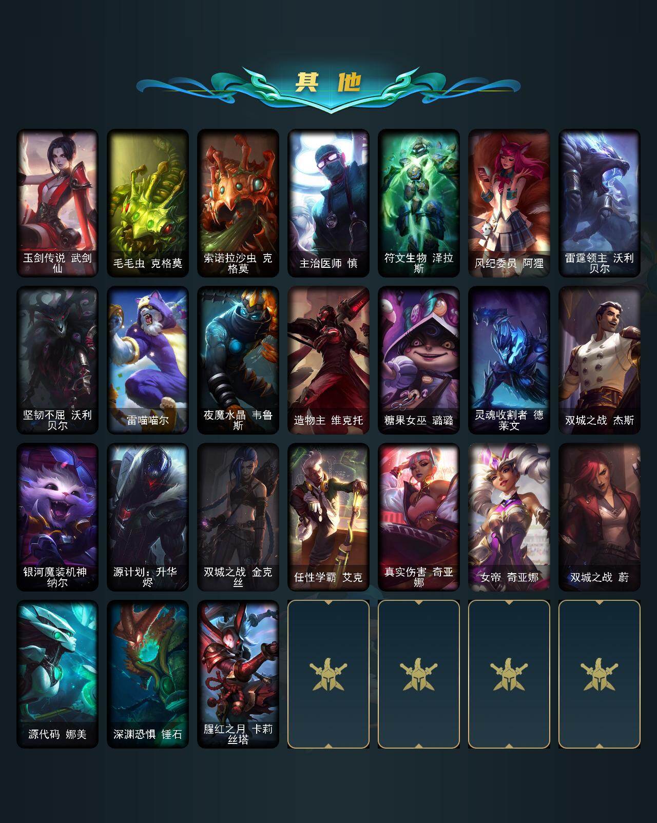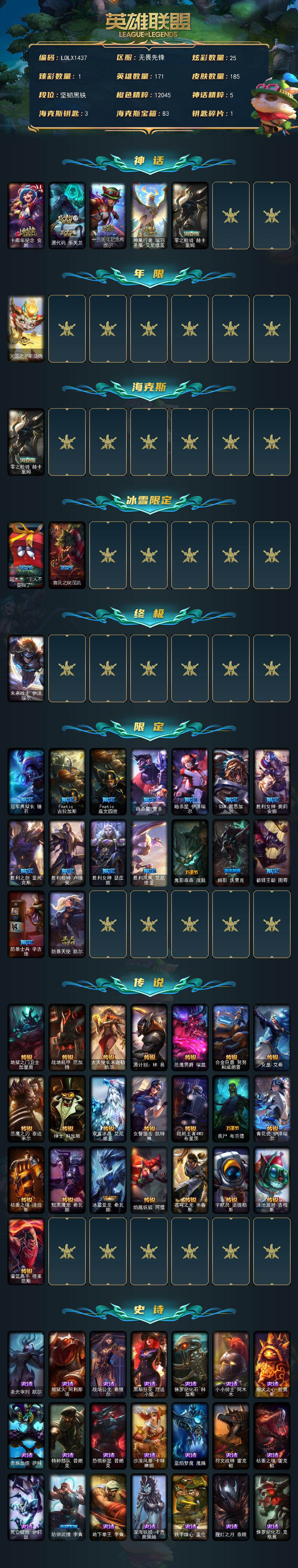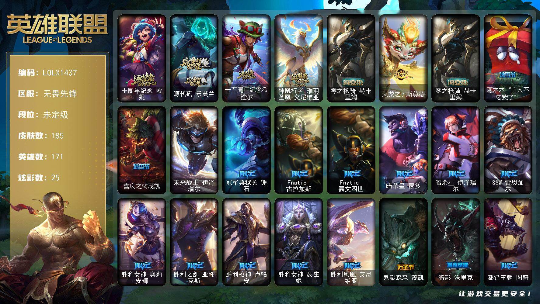 【471353】【LOLX1437】171英雄/185皮肤/1终极/5神话/19限定/1臻彩/25炫彩/22传说/40史诗/未定级/十周年纪念安妮/源代码乐芙兰/十五周年纪念希维尔/神凰行者瑞羽凤凰艾尼维亚/零之枪骑赫卡里姆/天龙之子斯莫德/阿木木:“主人不要我了”/喜庆之树茂凯/未来战士伊泽瑞尔/冠军典狱长锤石/Fnatic古拉加斯/Fnatic嘉文四世/暗杀星蒙多/暗杀星伊泽瑞尔/SSW雷恩