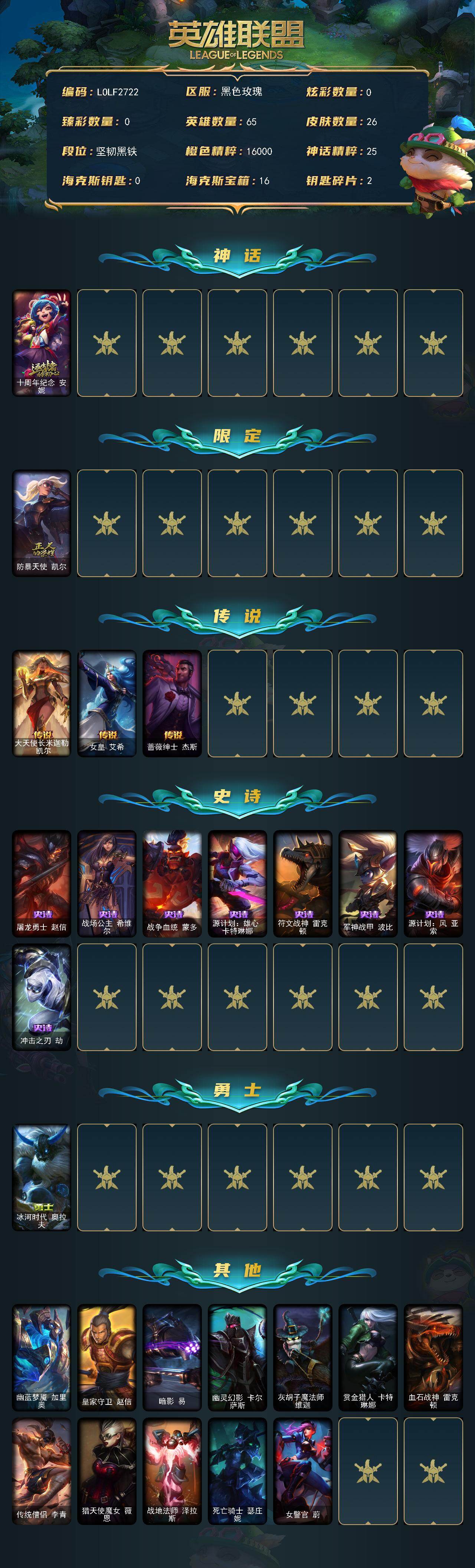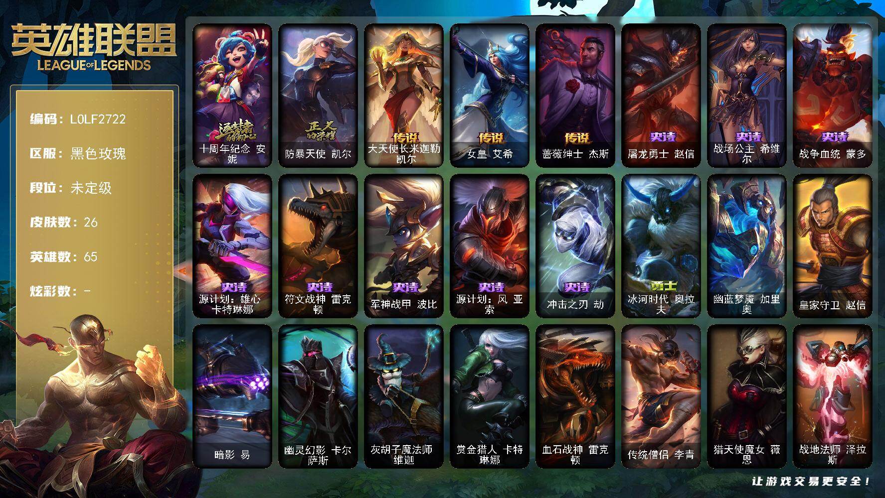 【471436】【LOLF2722】65英雄/26皮肤/1神话/1限定/3传说/8史诗/未定级/十周年纪念安妮/防暴天使凯尔/大天使长米迦勒凯尔/女皇艾希/蔷薇绅士杰斯/屠龙勇士赵信/战场公主希维尔/战争血统蒙多/源代码:雄心卡特琳娜/符文战神雷克顿/军神战甲波比/源代码:风亚索/冲击之刃劫/冰河时代奥拉夫/幽蓝梦魇加里奥/皇家守卫赵信/暗影易/幽灵幻影卡尔萨斯/灰胡子魔法师维迦/赏金猎人卡特琳