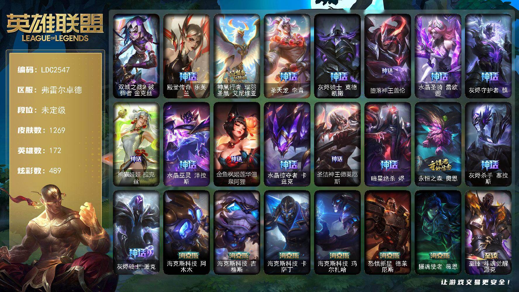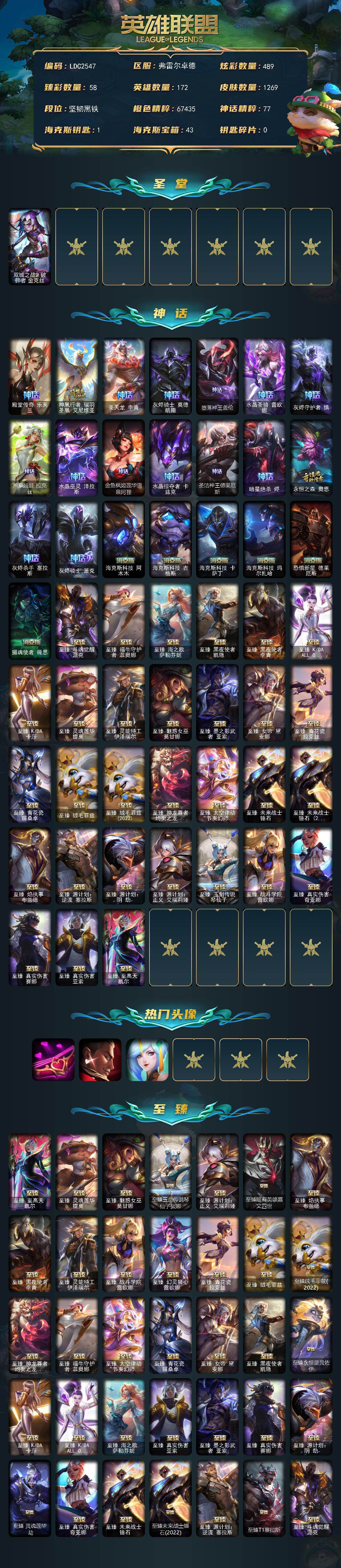 【471690】【LDC2547】172英雄/1269皮肤/6终极/58神话/257限定/58臻彩/489炫彩/109传说/158史诗/未定级/双城之战2破碎者金克丝/殿堂传奇乐芙兰/神凰行者瑞羽凤凰艾尼维亚/圣天龙李青/灰烬骑士莫德凯撒/堕落神王盖伦/水晶圣骑蕾欧娜/灰烬守护者慎/熊猫娃娃拉克丝/水晶巫灵泽拉斯/金鱼枫姬莲华温泉阿狸/水晶掠夺者卡兹克/圣洁神王德莱厄斯/暗星绝杀烬/永恒之森奥恩
