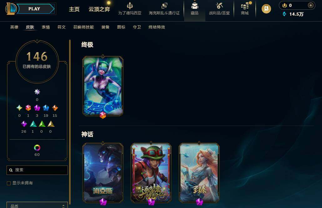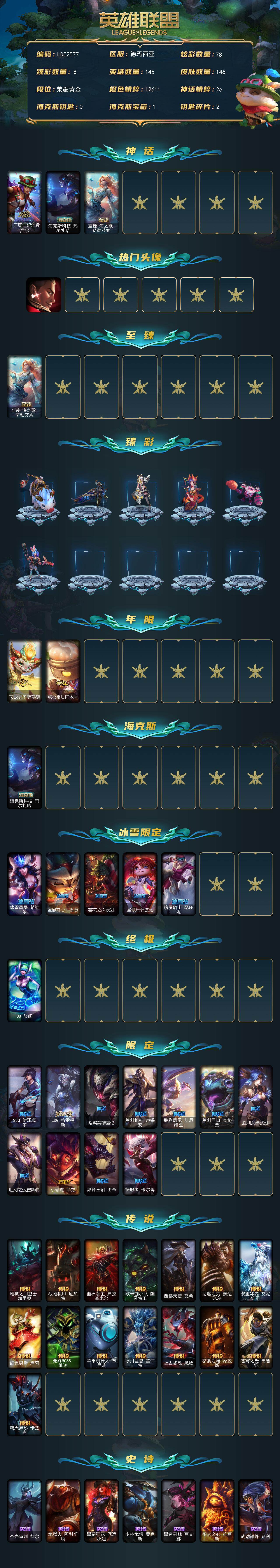 【476096】【LDC2577】145英雄/146皮肤/1终极/3神话/19限定/8臻彩/78炫彩/15传说/26史诗/黄金/十五周年纪念希维尔/海克斯科技玛尔扎哈/至臻海之歌萨勒芬妮/觅心游侠卢锡安/无畏骑士瑟庄妮赤子初心/西部天使赛娜神选天使长/咖啡甜心金克丝核桃巴菲/灵魂莲华卡西奥佩娅流火/可爱可爱粉红红布里茨/幻灵战斗队长厄运小姐勇气赞歌/魔女阿卡丽虚荣/霸天异形卡兹克黄金异端/天龙之