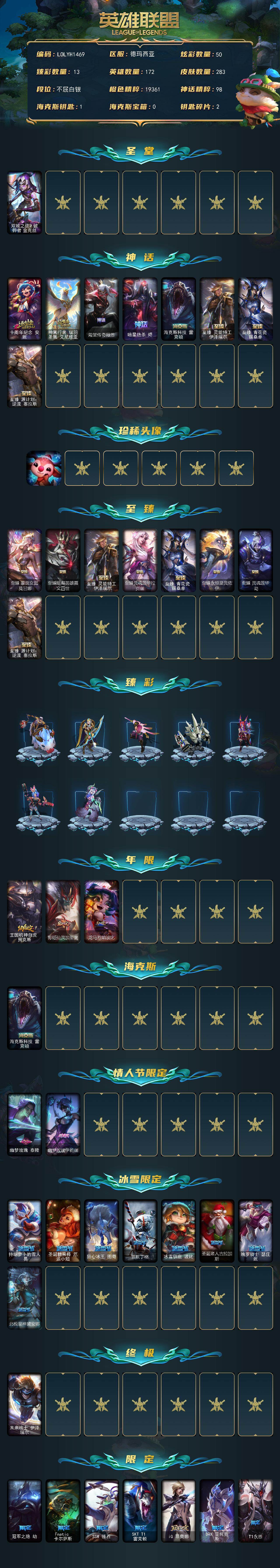 【476866】【LOLYH1469】172英雄/283皮肤/1终极/13神话/37限定/13臻彩/50炫彩/28传说/51史诗/白银/双城之战2破碎者金克丝/十周年纪念安妮/神凰行者瑞羽凤凰艾尼维亚/殿堂传奇薇恩/暗星绝杀烬/海克斯科技雷克顿/至臻灵能特工伊泽瑞尔/至臻青花瓷丽桑卓/至臻源计划:逆流塞拉斯/至爱的鹿/至臻蒙面女郎莫甘娜/至臻暗裔英雄嘉文四世/至臻灵魂莲华拉克丝/至臻永恒星灵佐伊