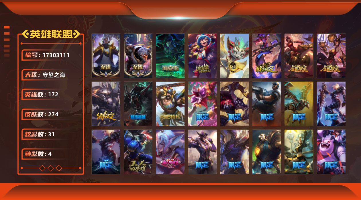 【509635】[17303111]【特价出售/店主推荐】黄金段位-172英雄-274皮肤-31炫彩-0终极-4神话-43限定-29传说-72史诗【神话皮肤】:十周年纪念安妮,摄魂使者薇恩,至臻真实伤害亚索,至臻源计划阴劫【至臻皮肤】:至臻真实伤害亚索,至臻源计划阴劫【臻彩皮肤】:无畏骑士瑟庄妮赤子初心,霸天异形卡兹克掠空魅影,星之守护者霞烈羽,红莲之刃锐雯【年限皮肤】:玉净夜叉凯特琳,金猪烈焰