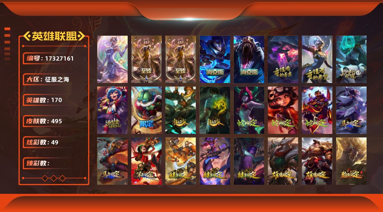 【513261】[17327161]1终极 8神话 116限定 60传说 108史诗 495皮肤 49炫彩 170英雄 可二次 可修改实名 【至臻】至臻 K/DA 阿狸,至臻 K/DA 阿狸(2022) 【海克斯】海克斯 嘉文四世,海克斯 雷克顿 【限定】钢铁军团 拉克丝,创星之灵 璐璐 【情人节限定】觅心之翼 奎因,觅心女王 艾希,水晶玫瑰 斯维因,觅心游侠 卢锡安,觅心猎手 薇恩,幽梦玫瑰