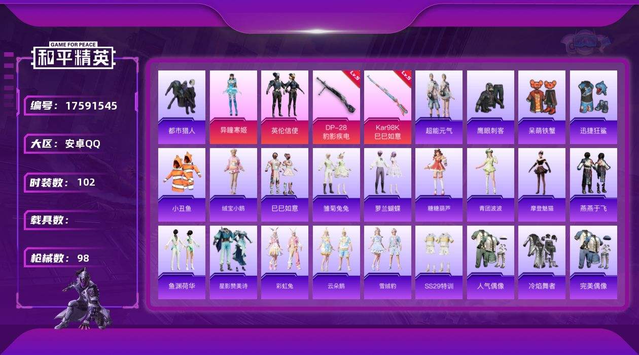 【549244】[17591545]安卓 手Q-2粉装-4特效枪-0载具-1粉色飞行器-30177热力值-4王牌印记-102套装-98枪皮【热门品类】:套装-都市猎人,套装-小丑鱼【粉色套装】:粉装-英伦信使,角色-异瞳寒姬【粉色枪皮等级】:UMP45-萌骑冒险(二级),Kar98K-巳巳如意(五级),Mk14-福马献瑞(五级),DP-28-豹影疾电(五级)【粉色枪皮】:UMP45-萌骑冒险,K