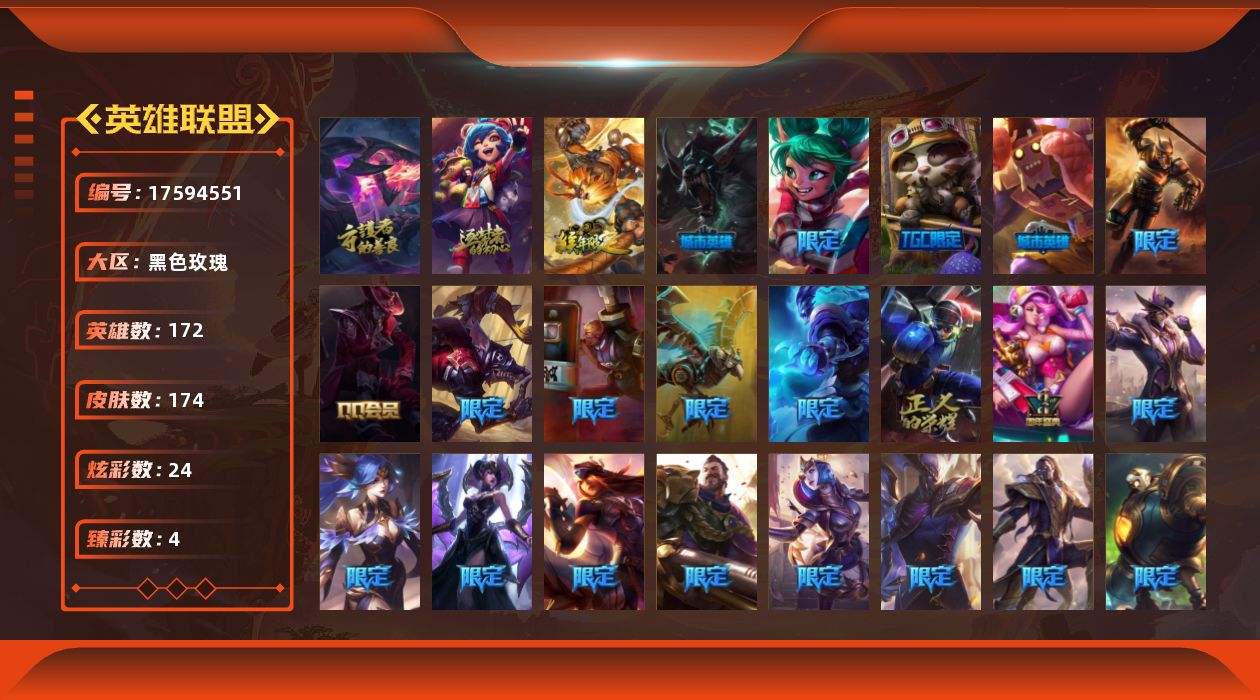 【549947】[17594551]铂金段位-172英雄-174皮肤-24炫彩-0终极-2神话-38限定-20传说-44史诗【神话皮肤】:十周年纪念安妮,暗星科加斯【臻彩皮肤】:冠军之志瑞兹凯旋圣装,源计划毁灭派克幻灭,幻灵战斗蝠薇恩梦幻强袭,魔女阿卡丽虚荣【年限皮肤】:美猴王孙悟空【冰雪限定】:圣诞开心鬼提莫,圣诞糖果棒厄运小姐,平安夜女神娑娜,圣诞玩偶波比,圣诞老人古拉加斯,魄罗骑士瑟庄妮,