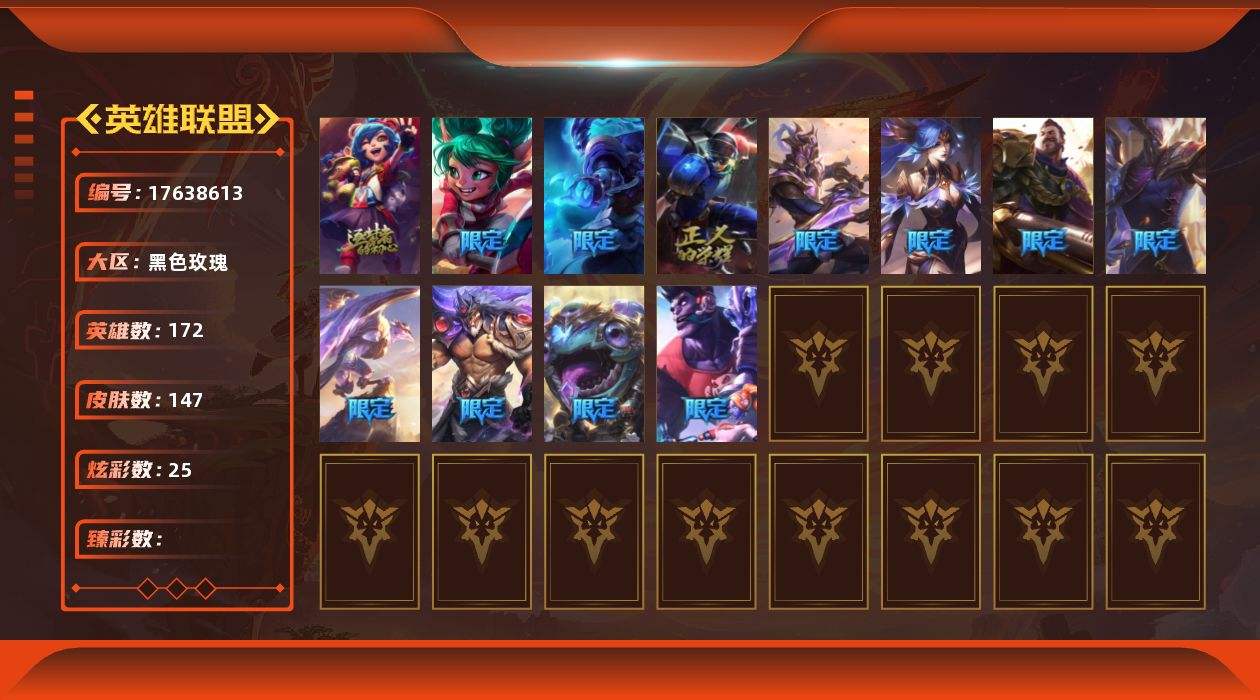 【555688】[17638613]【特价出售/店主推荐】白银段位-172英雄-147皮肤-25炫彩-0终极-2神话-13限定-10传说-43史诗【神话皮肤】:十周年纪念安妮,神凰行者瑞羽圣凰艾尼维亚【限定皮肤】:冠军典狱长锤石,暗杀星蒙多,胜利枪神格雷福斯,胜利之剑亚托克斯,胜利凤凰艾尼维亚,胜利之王泰达米尔,胜利巨口克格莫,胜利女神娑娜,胜利剑圣易,胜利女神菲奥娜,无头骑士赫卡里姆,波比的巧