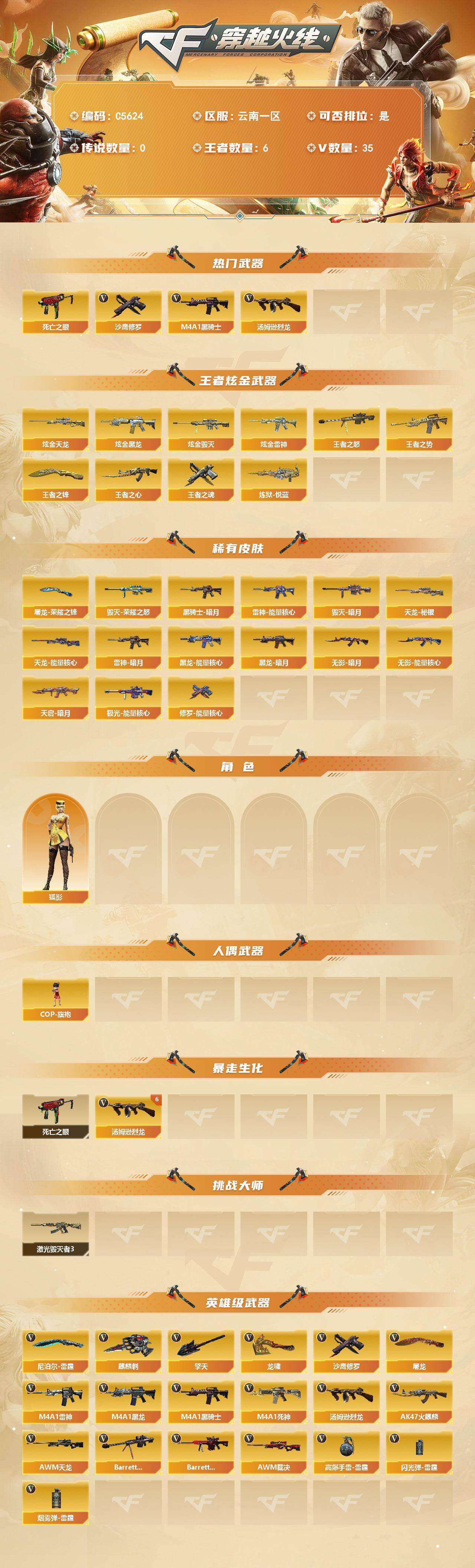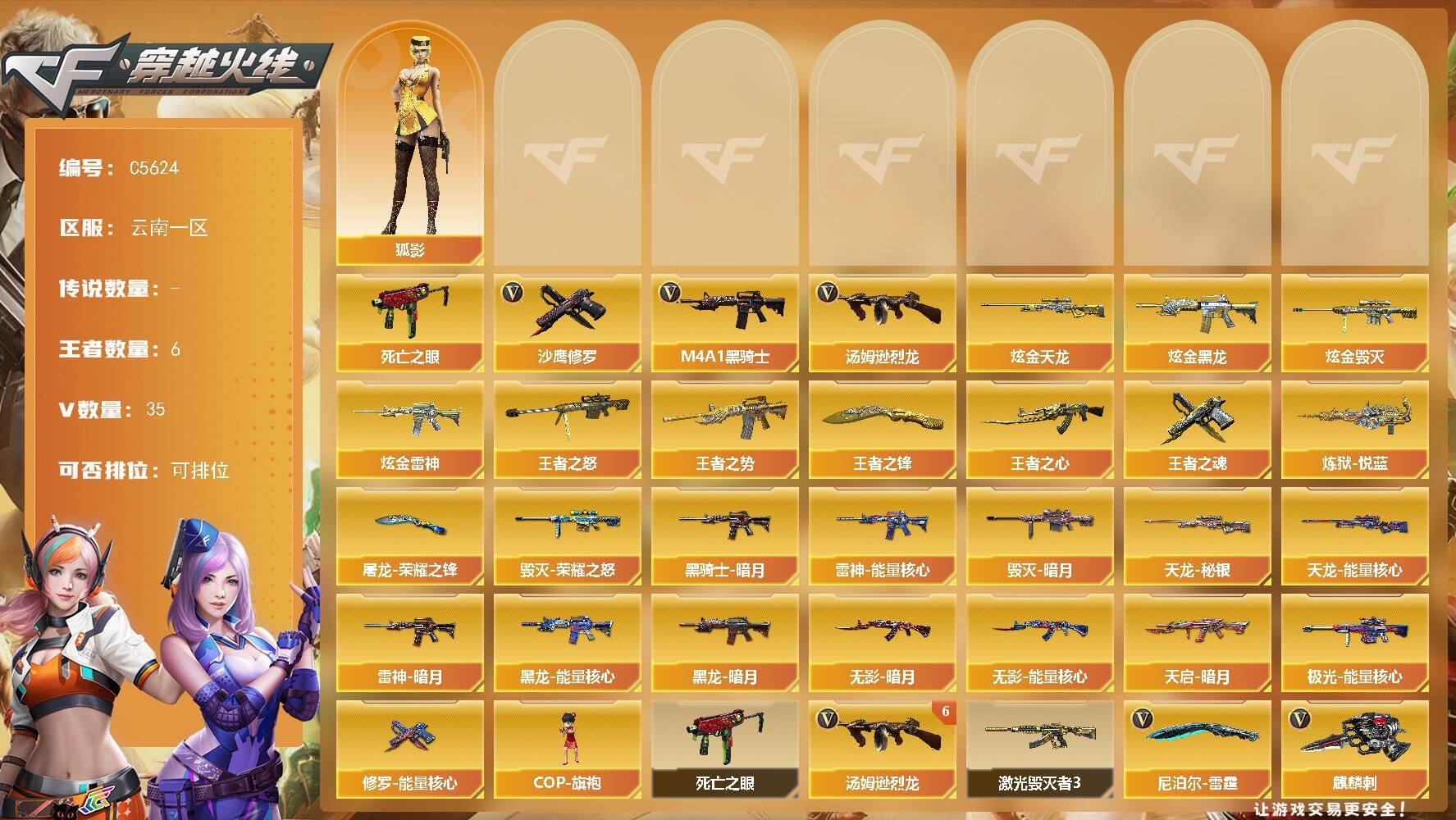 【556516】【C5624】云南一区-35V-6王者武器数-4炫金武器数【热门武器】:死亡之眼,M4A1-黑骑士,汤姆逊-烈龙*6,沙鹰-修罗*5【王者炫金武器】:王者之势,王者之心,王者之怒,炼狱-悦蓝,王者之魂,王者之锋,炫金黑龙,炫金雷神,炫金毁灭,炫金天龙【皮肤】:雷神-暗月,雷神-能量核心,毁灭-暗月,毁灭-荣耀之怒,黑龙-能量核心,黑龙-暗月,黑骑士-暗月*2,无影-暗月*2,无影