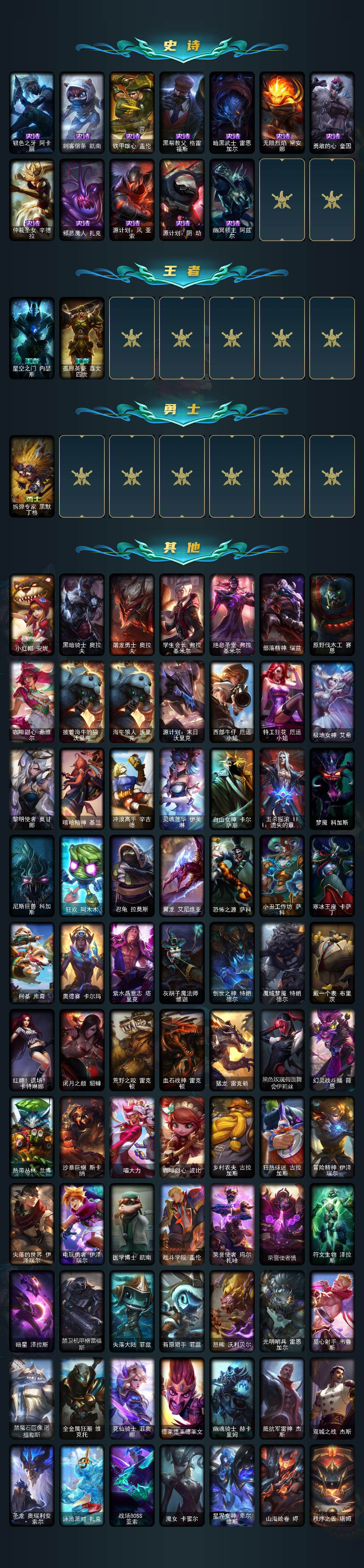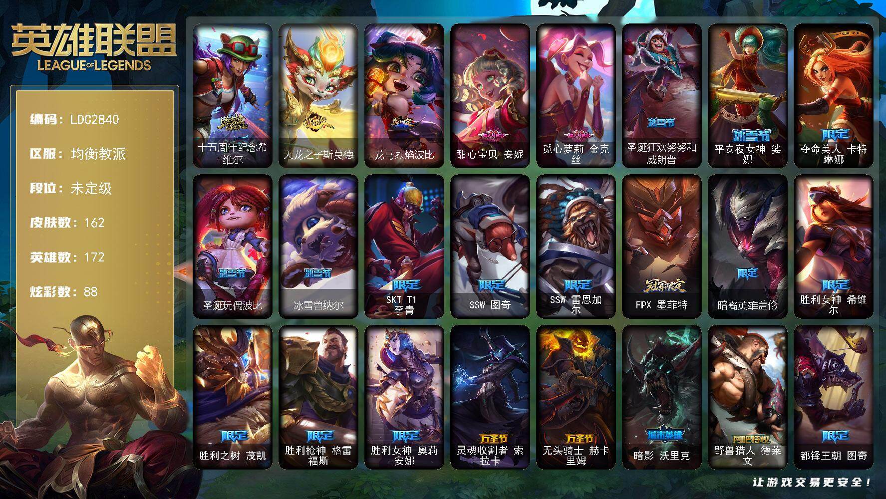 【559527】【LDC2840】172英雄/162皮肤/1神话/26限定/8臻彩/88炫彩/15传说/33史诗/未定级/十五周年纪念希维尔/替父从军花木兰炫金龙刃/征服者韦鲁斯炫金/黎明使者锐雯黑夜使者/霸天巨兽雪崩墨菲特/霸天异形卡兹克刹那银光/灵魂莲华锐雯流火/魔女阿卡丽虚荣/天龙之子斯莫德/龙马烈焰波比/甜心宝贝安妮/觅心萝莉金克丝/圣诞狂欢努努和威朗普/平安夜女神娑娜/夺命美人卡特琳娜