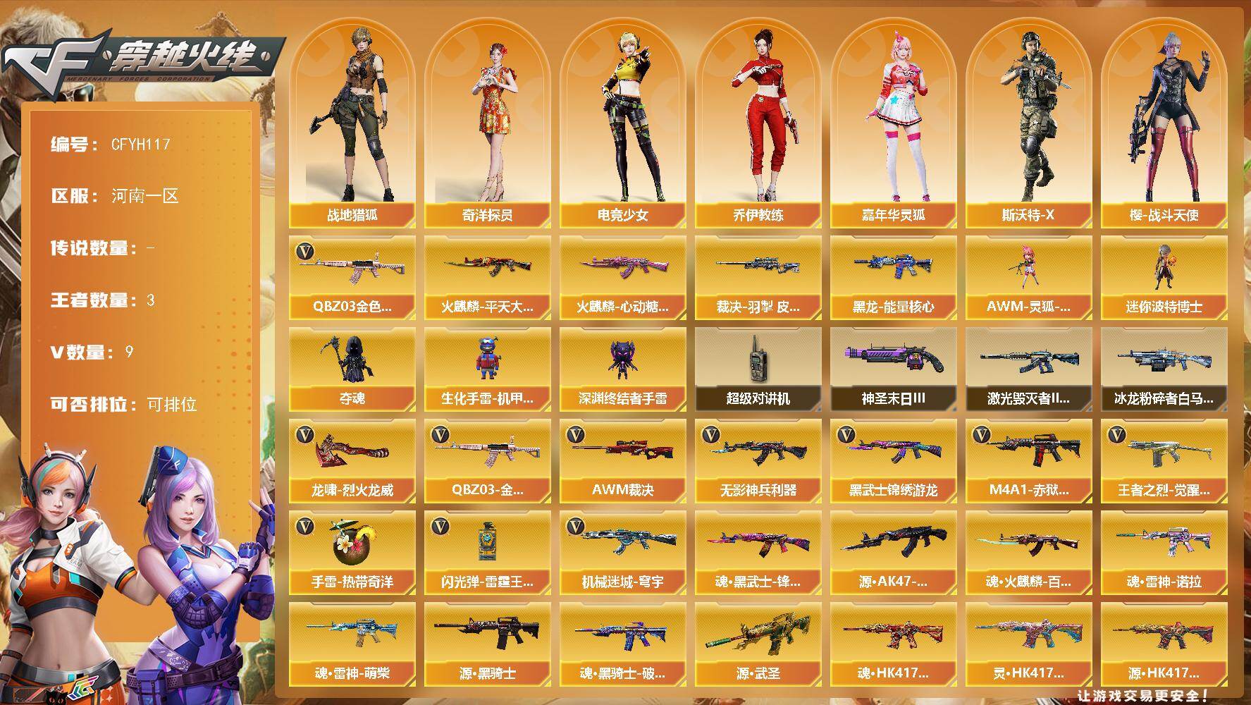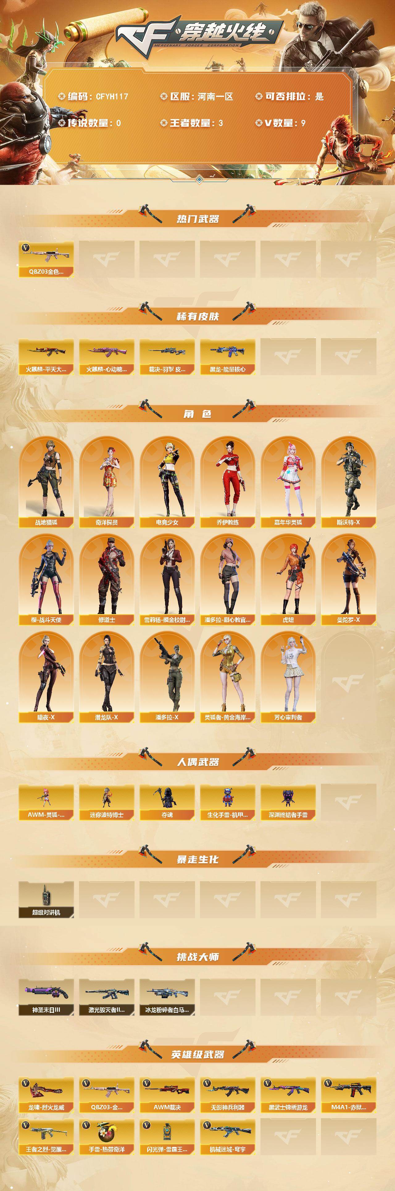 【559623】【559623】【CFYH117】8V/96级/将帅/3王者/1英雄/QBZ03-金色蔷薇/裁决-羽掣 皮肤/火麒麟-平天大圣/火麒麟-心动糖