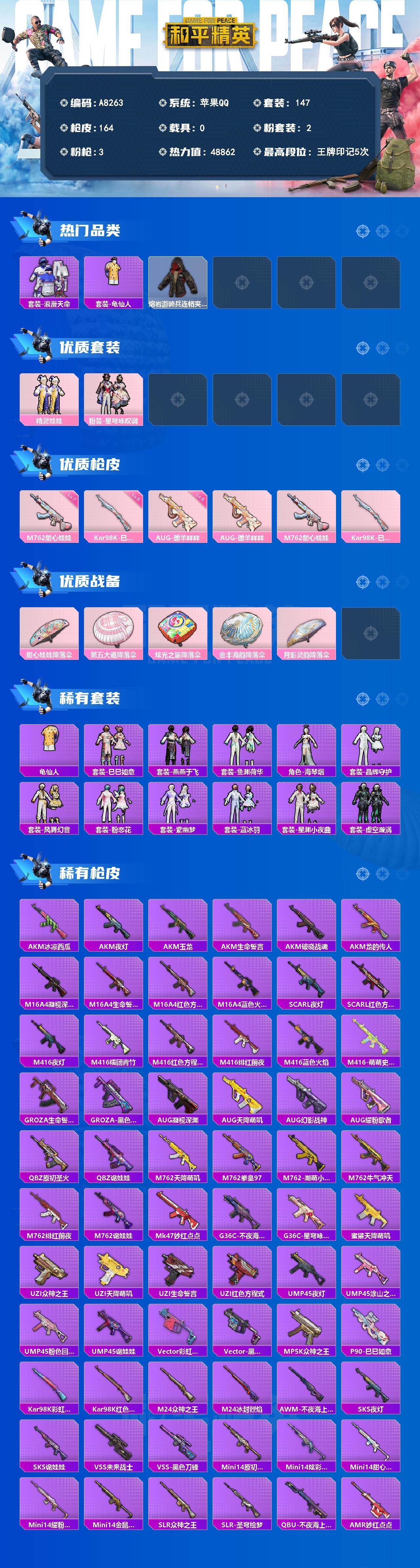 【559673】【不可二次】【苹果QQ】龟仙人 第五大道降落伞 甜心娃娃降落伞 M249-古堡领主 风华少年志 幻影公爵 极速红龙 浪漫天命 摇滚狂鲨 M762-潮萌小黄鸭 雪山精英 M762-甜心娃娃