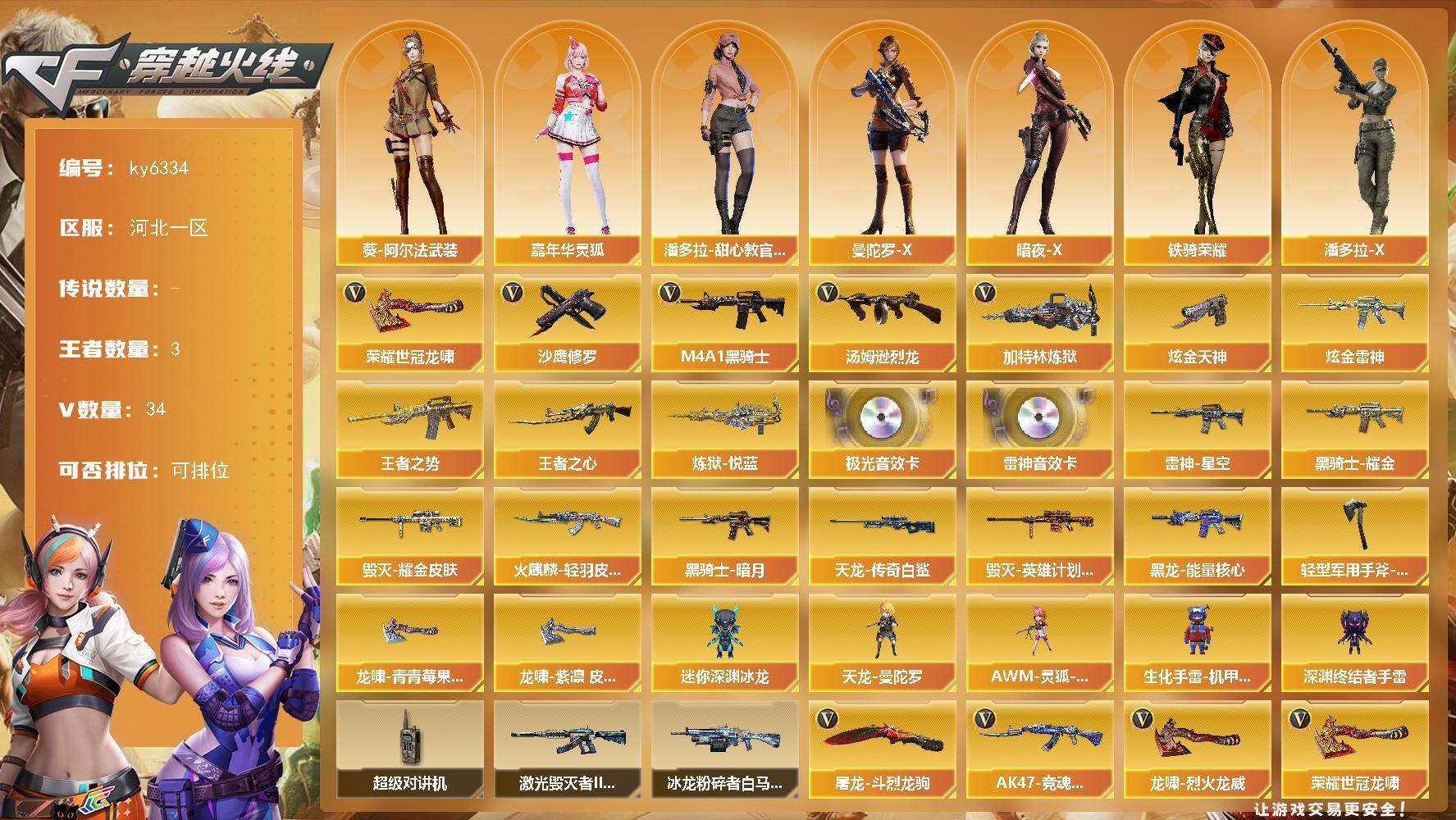 【559905】【559905】河北一区-37V-3王者武器数-2炫金武器数【热门武器】:M4A1-黑骑士,汤姆逊-烈龙,加特林-炼狱,沙鹰-修罗*2,荣耀世