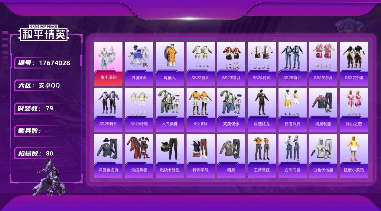 【560122】[17674028]【FK6502】79套装/装备89/战备82/王牌印记7/热力值23047/浪漫天命/龟仙人/金丰海韵/深海曼妙降落伞/心之恋语降落伞/精灵梦叶罗丽降落伞/星穹咏叹调降落伞/AKM-彩虹符号/AKM-星兔领航员/AKM-破晓战魂/AKM-龙的传人/M16A4-蓝色火焰/SCAR-L-红色方程式/M416-糯团青竹/M416-红色方程式/M416-蓝色火焰/GR