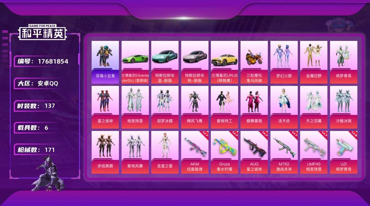 【560820】【可二次】【安卓QQ】UZI-绮梦青鸾 金属狂野 洛天依 空客蔚蓝之翼 赤焰黑爵 蝶舞蔷薇 深海小丑鱼 浪漫波比 特斯拉R水滴蓝 天之羽翼 AUG-星之彼岸 甜梦冰蝶 紫电风暴 兰博SVJ绿色 M762-激战未来 特斯拉R沁心粉 兰博SUV黄色 相思残雪 AKM-炫紫旋律 蜜桃特工 梦幻火箭 鬼马风驰 汤姆逊-怪笑疯兔 UMP45-相思残雪 冷魅冰骑 GROZA-香水柠檬