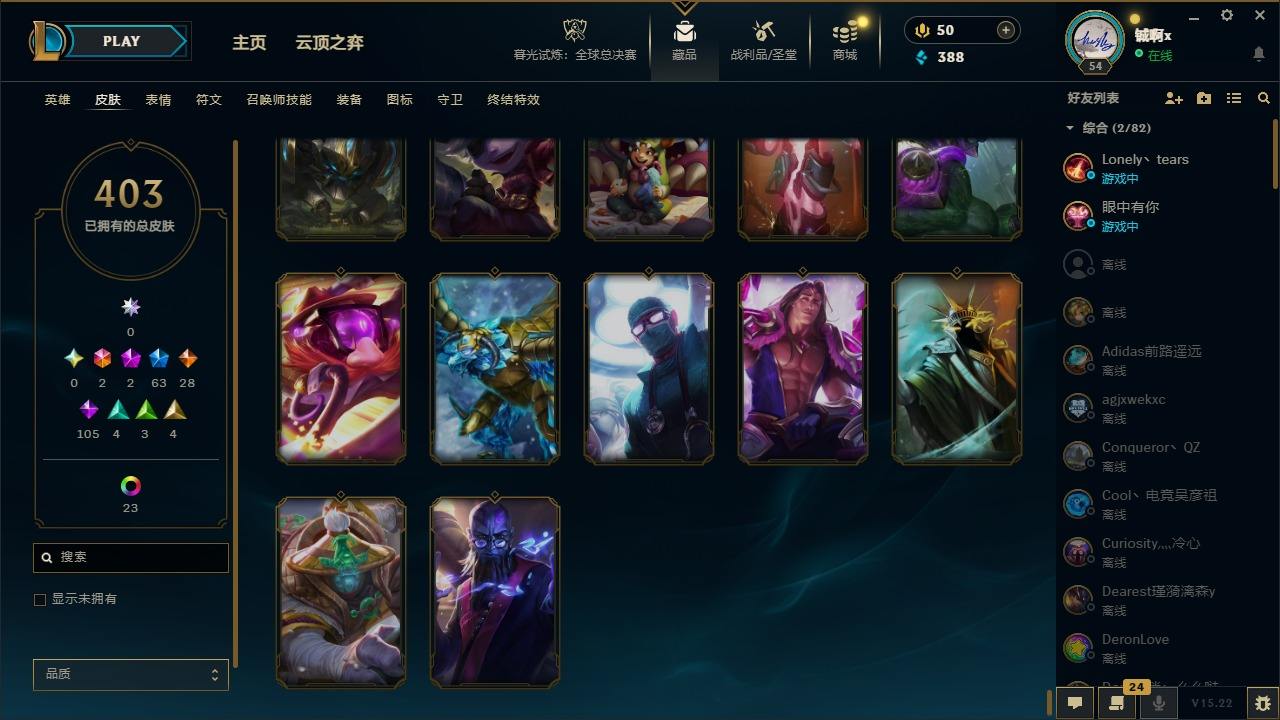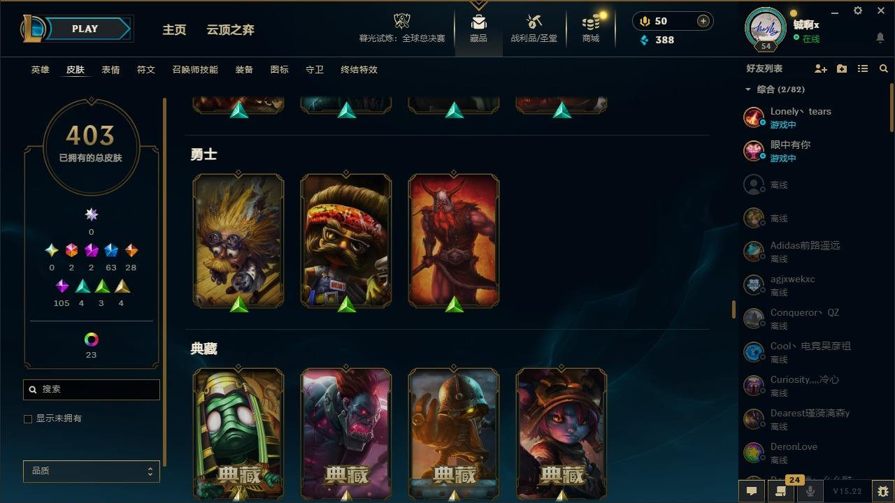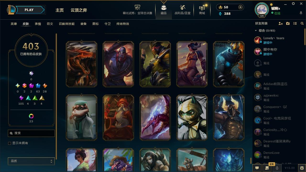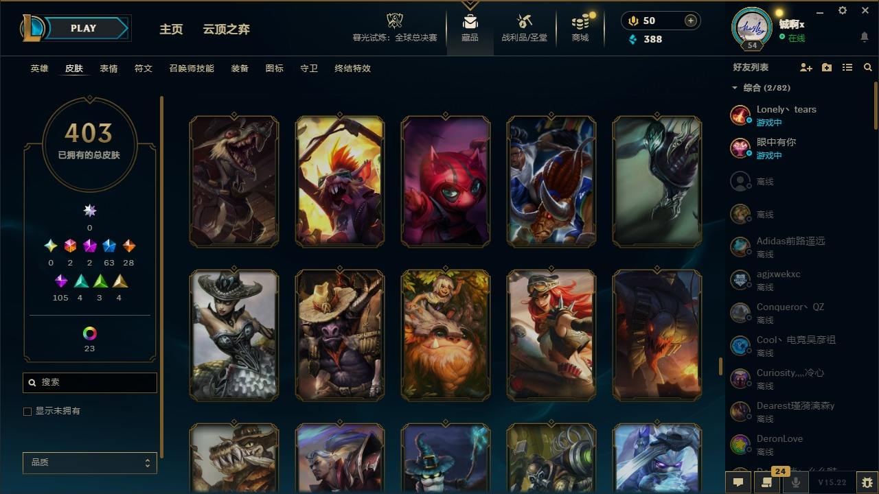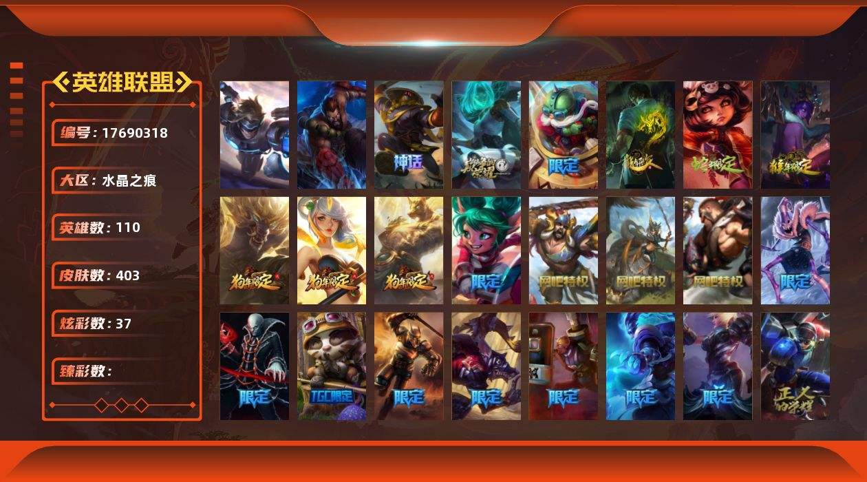 【561517】[17690318]2终极 2神话 63限定 28传说 105史诗 403皮肤 37炫彩 110英雄 可二次 可修改实名 【情人节限定】觅心猎手 薇恩,甜心宝贝 安妮,甜心宝贝 娑娜 【赛季限定皮】胜利女神 希维尔 【冠军限定系列】S1FNC 酒桶,S1FNC 迦娜,S2 暗杀星 伊泽瑞尔,S3 SKT T1 劫,S3 SKT T1 薇恩,S4 SSW 图奇,S4 SSW 炼金