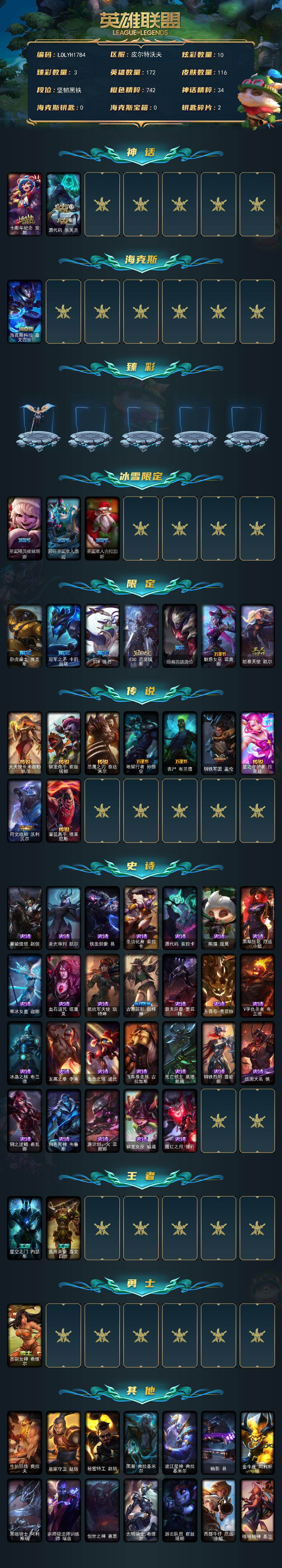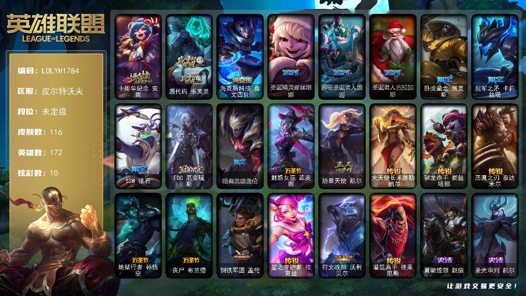 【569587】【LOLYH1784】172英雄/116皮肤/3神话/10限定/3臻彩/10炫彩/9传说/26史诗/未定级/十周年纪念安妮/源代码乐芙兰/玉剑传说翼剑仙珠光/心之钢伊泽瑞尔锐意曲风/黑夜使者嘉文四世白夜/海克斯科技嘉文四世/圣诞精灵崔丝塔娜/邪恶圣诞老人维迦/圣诞老人古拉加斯/卧虎藏龙贾克斯/冠军之矛卡莉斯塔/SSW锤石/EDG厄斐琉斯/暗裔英雄盖伦/魅惑女巫菲奥娜/防暴天使凯尔