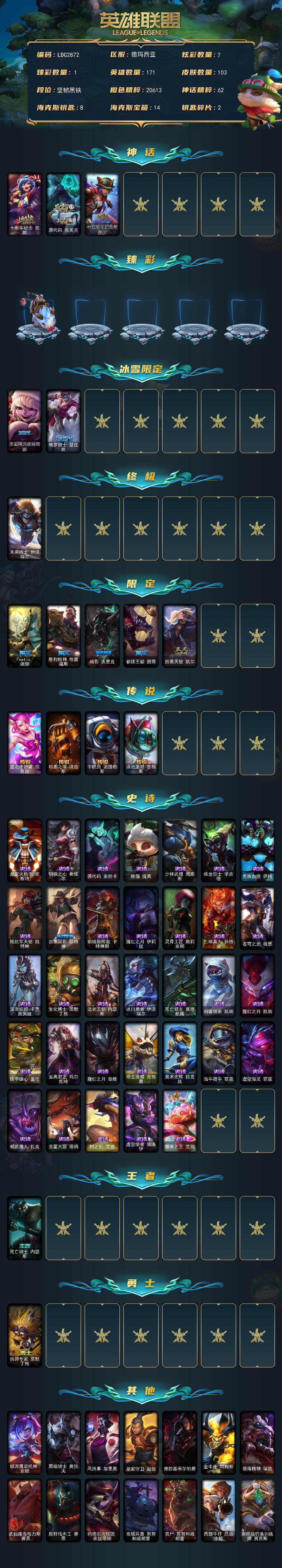 【569829】【LDC2872】171英雄/103皮肤/1终极/3神话/7限定/1臻彩/7炫彩/4传说/33史诗/未定级/十周年纪念安妮/源代码乐芙兰/十五周年纪念希维尔/无畏骑士瑟庄妮赤子初心/圣诞精灵崔丝塔娜/魄罗骑士瑟庄妮/未来战士伊泽瑞尔/Fnatic迦娜/胜利枪神格雷福斯/暗影妖狐阿狸/都铎王朝图奇/防暴天使凯尔/星之守护者拉克丝/枯萎之壤泽拉斯/宇航员诺提勒斯/泳池派对吉格斯/皇家