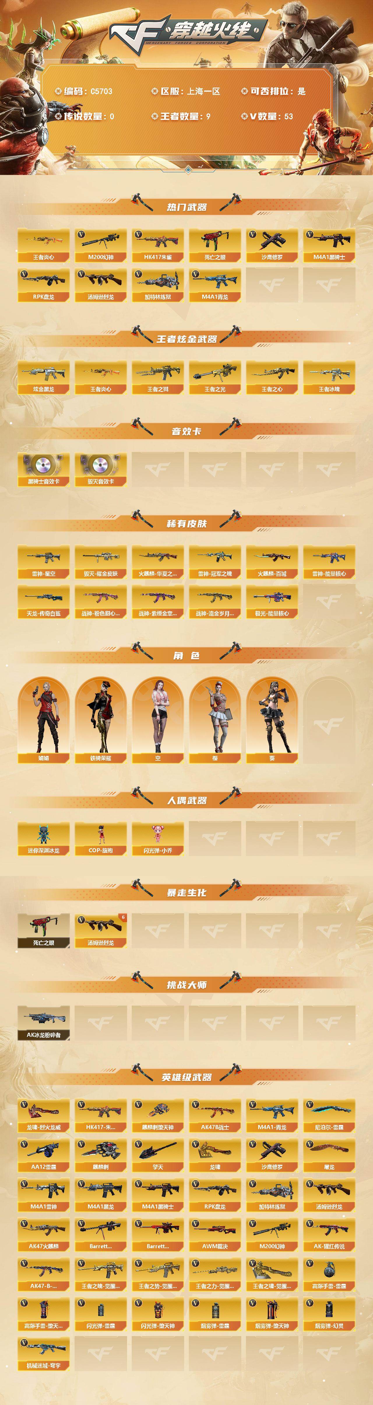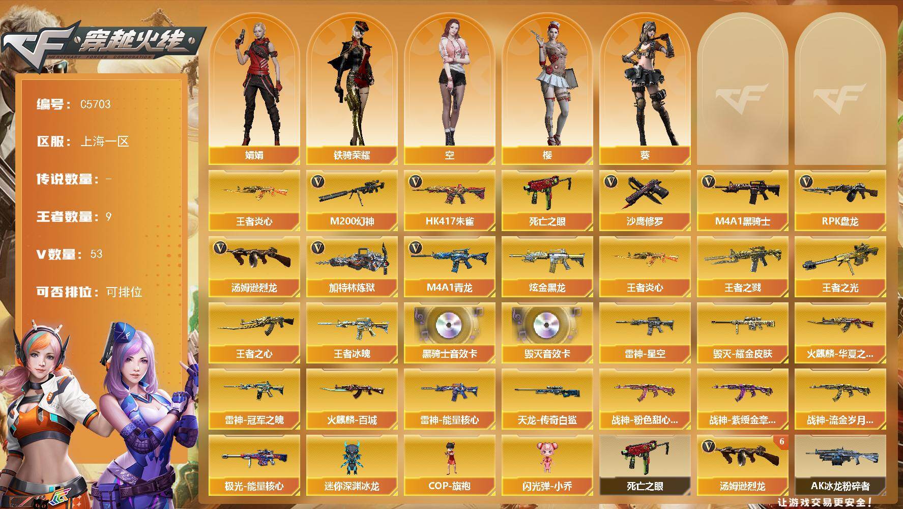 【570980】【570980】【C5703】上海一区-57V-9王者武器数-1炫金武器数【热门武器】:HK417-朱雀,M4A1-青龙,M200-幻神,死亡