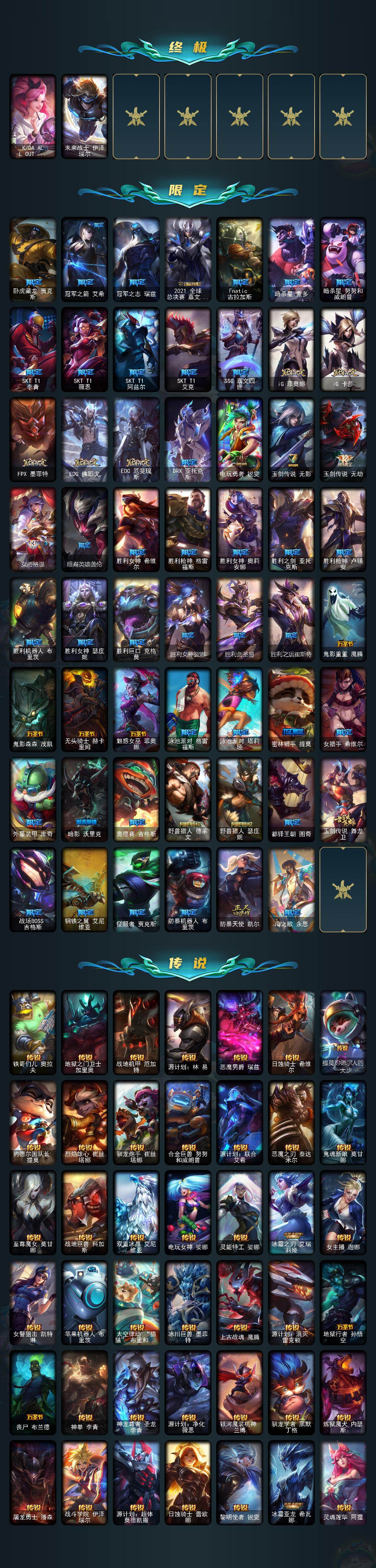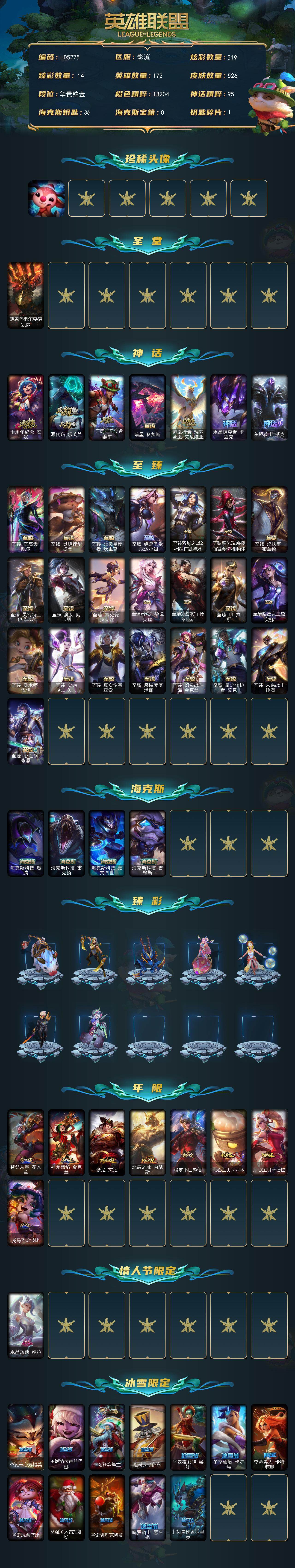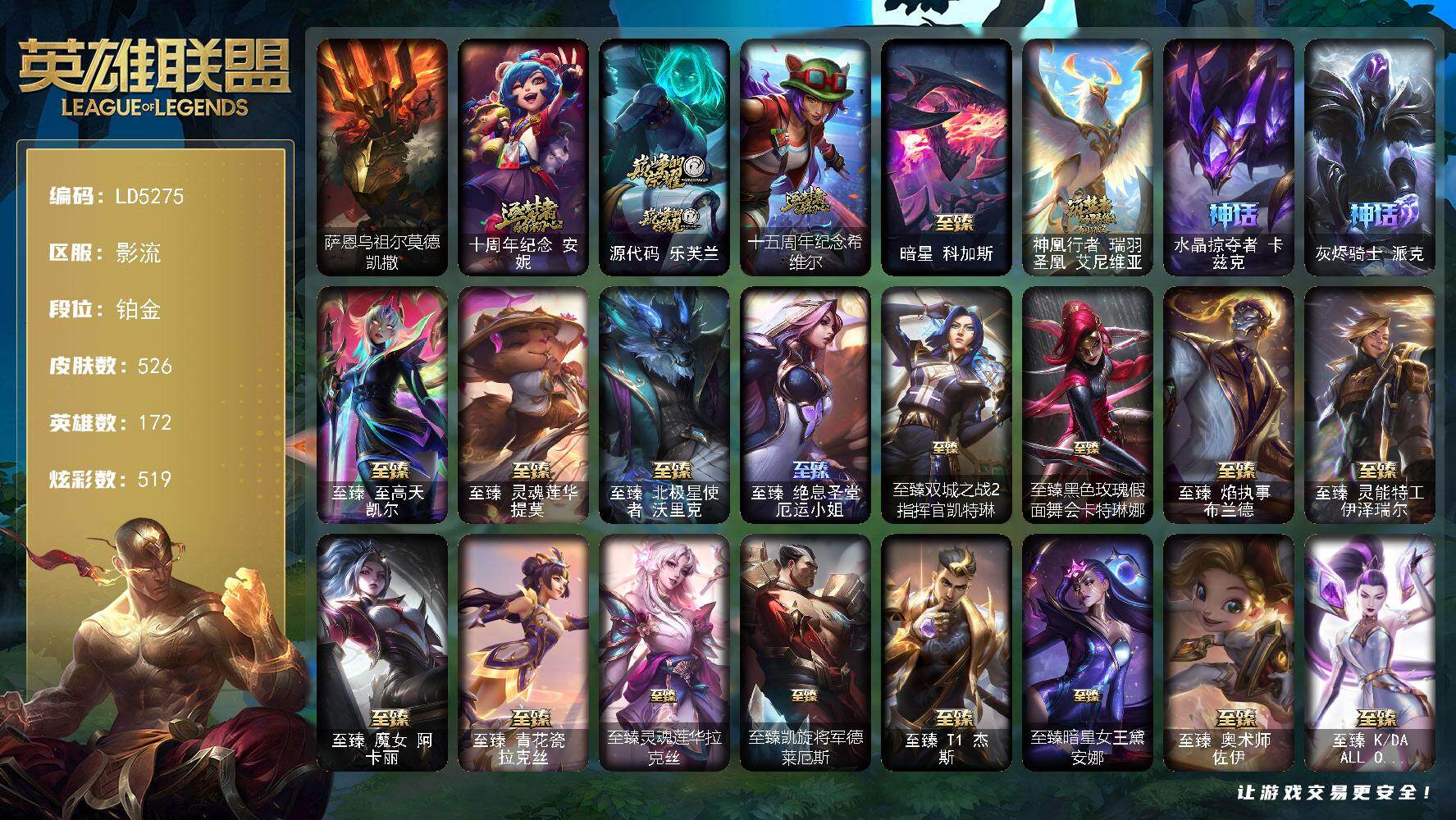 【571502】【LD5275】172英雄/526皮肤/4终极/33神话/76限定/14臻彩/519炫彩/58传说/103史诗/铂金/萨恩乌祖尔莫德凯撒/十周年纪念安妮/源代码乐芙兰/十五周年纪念希维尔/暗星科加斯/神凰行者瑞羽凤凰艾尼维亚/水晶掠夺者卡兹克/灰烬骑士派克/至爱的鹿/至臻至高天凯尔/至臻灵魂莲华提莫/至臻北极星使者沃里克/至臻绝息圣堂厄运小姐/至臻双城之战2指挥官凯特琳/至臻黑色
