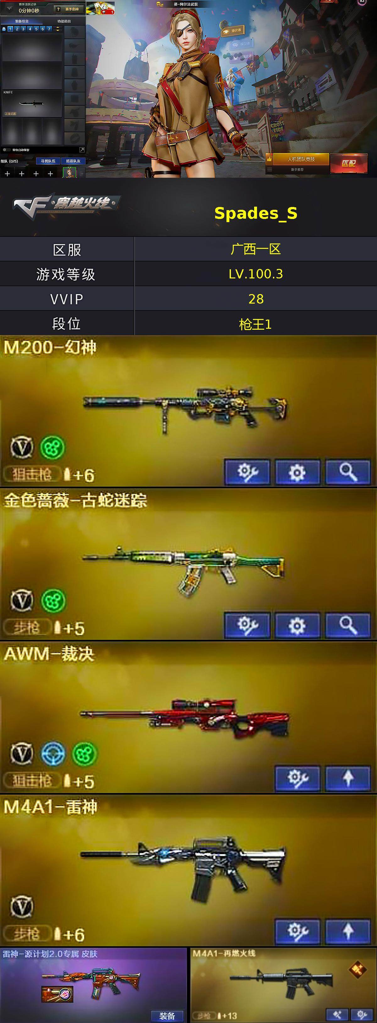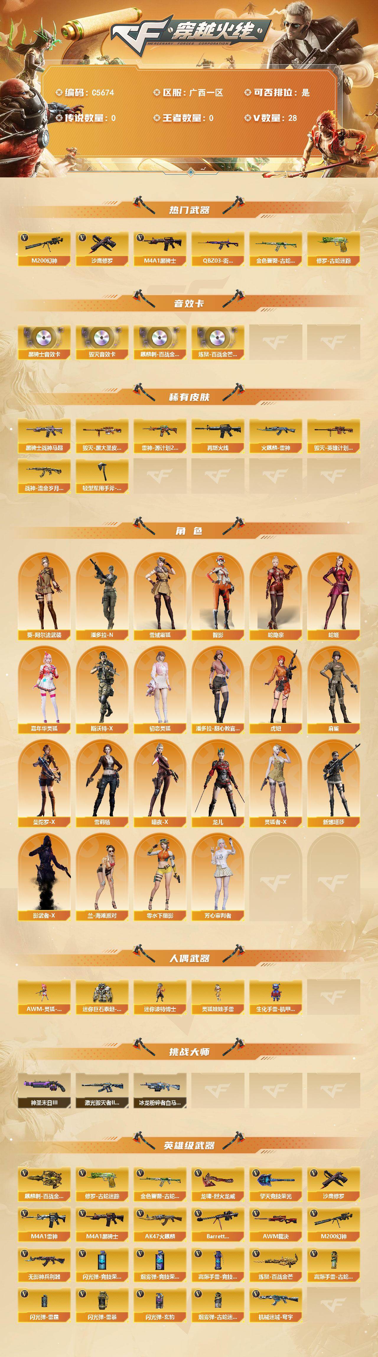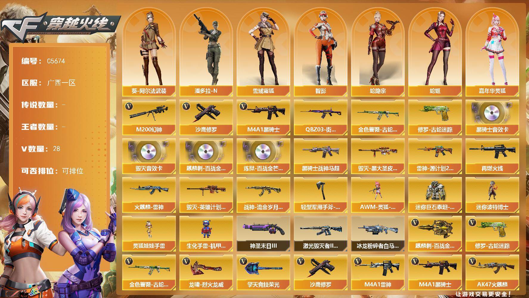 【571274】【571274】【C5674】广西一区-24V-0王者武器数-0炫金武器数【热门武器】:M200-幻神,金色蔷薇-古蛇迷踪,修罗-古蛇迷踪,Q