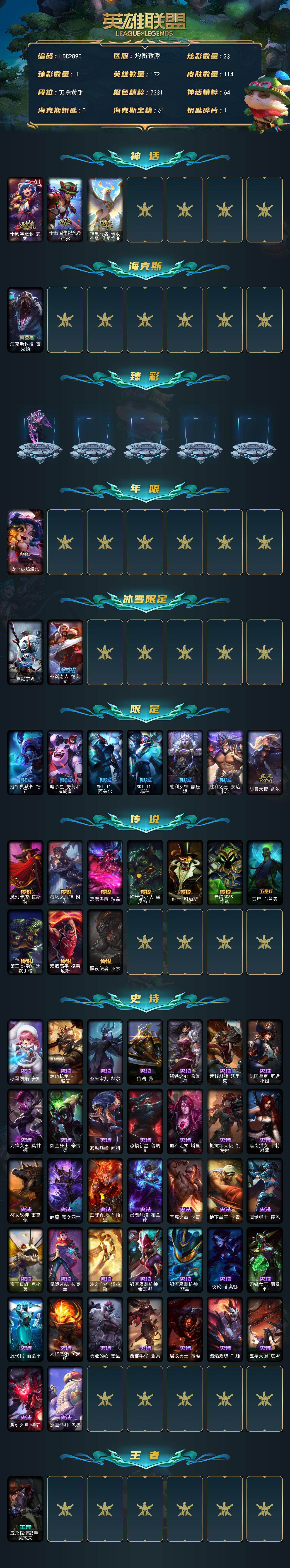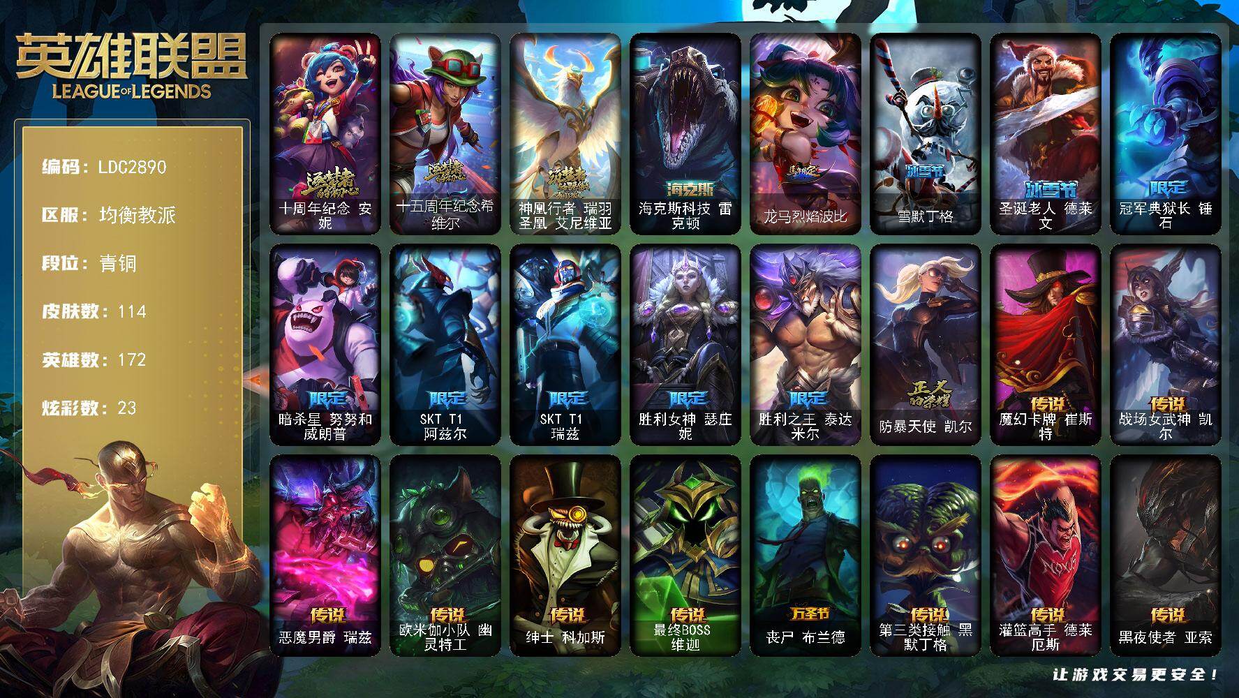 【572267】【LDC2890】172英雄/114皮肤/4神话/10限定/1臻彩/23炫彩/10传说/37史诗/青铜账号等级:297/十周年纪念安妮/十五周年纪念希维尔/神凰行者瑞羽凤凰艾尼维亚/天煞劫恒星游历者/龙马烈焰波比/海克斯科技雷克顿/雪默丁格/圣诞老人德莱文/冠军典狱长锤石/暗杀星努努和威朗普/SKTT1阿兹尔/SKTT1瑞兹/胜利女神瑟庄妮/胜利之王泰达米尔/防暴天使凯尔/魔幻卡