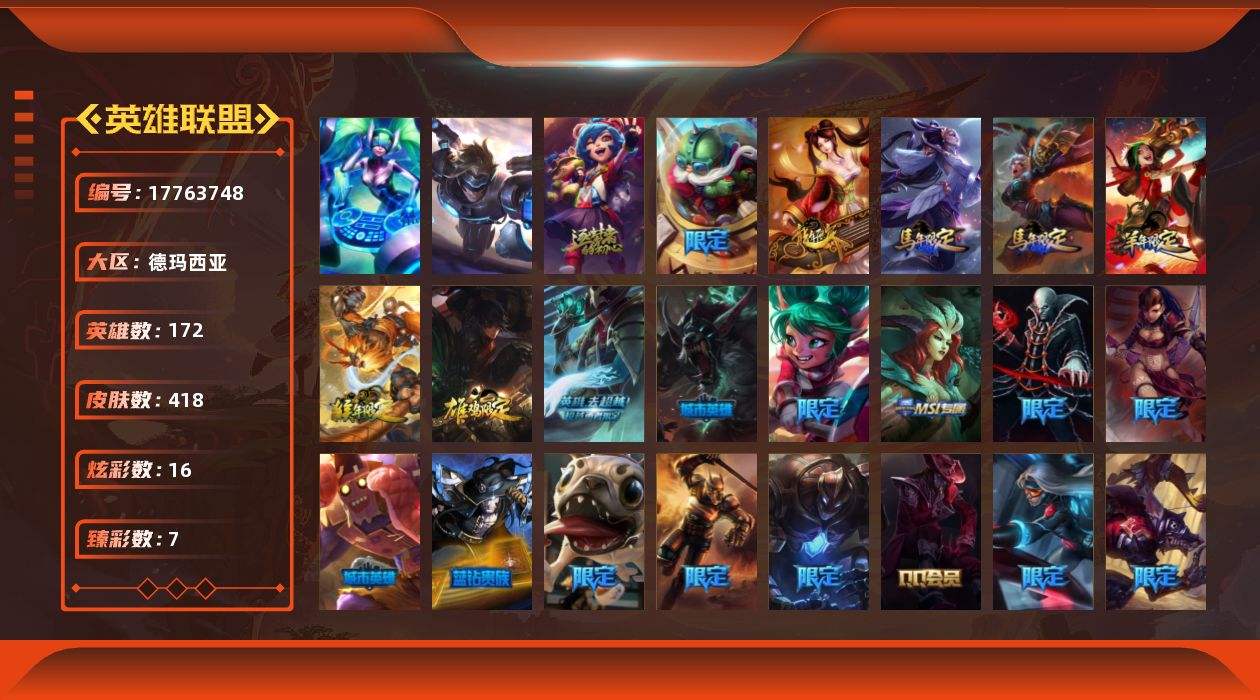 【572345】[17763748]可二次【特价出售/店主推荐】白银段位-172英雄-418皮肤-16炫彩-2终极-2神话-77限定-32传说-118史诗【热门头像】:卡特琳娜的匕首头像【臻彩皮肤】:天龙之子卡莎飞龙乘云,无畏骑士瑟庄妮赤子初心,墨之影武者亚索金墨耀影,闭月之颜貂蝉炫金莲华,魔女阿卡丽虚荣,净雪之月莫甘娜冬虹,红莲之刃锐雯【年限皮肤】:古琴余韵娑娜,定海神珍孙悟空,替父从军花木兰