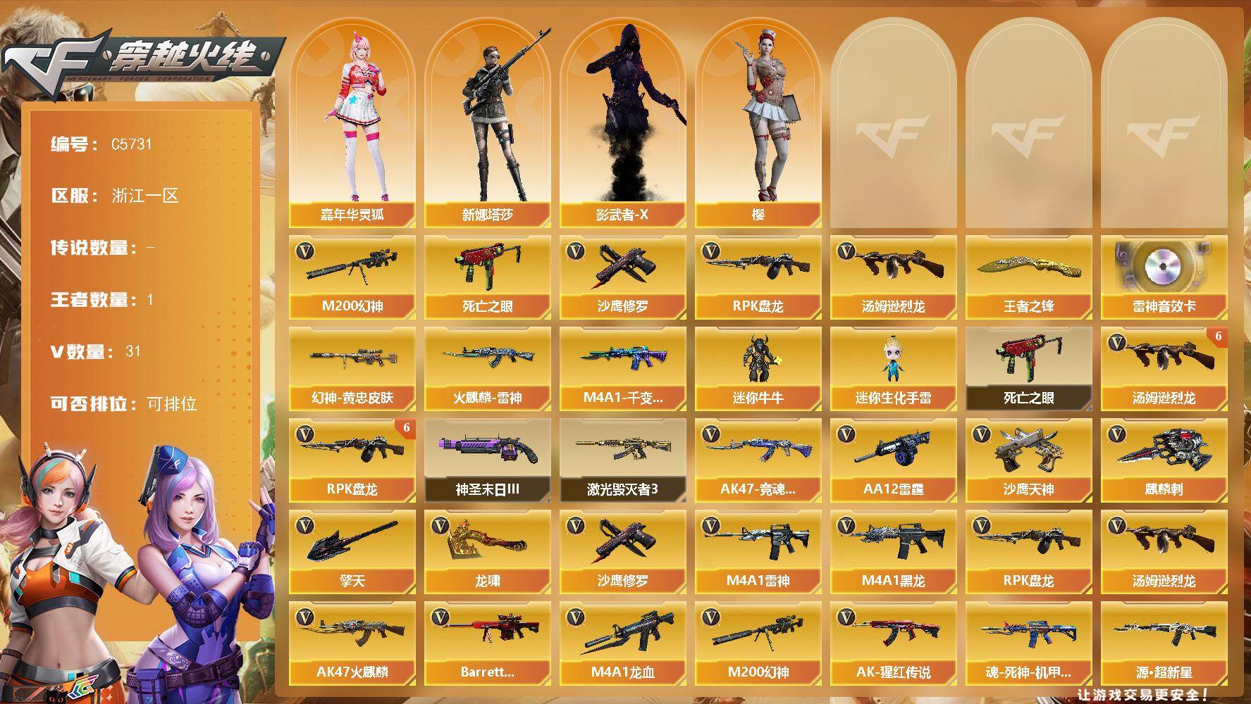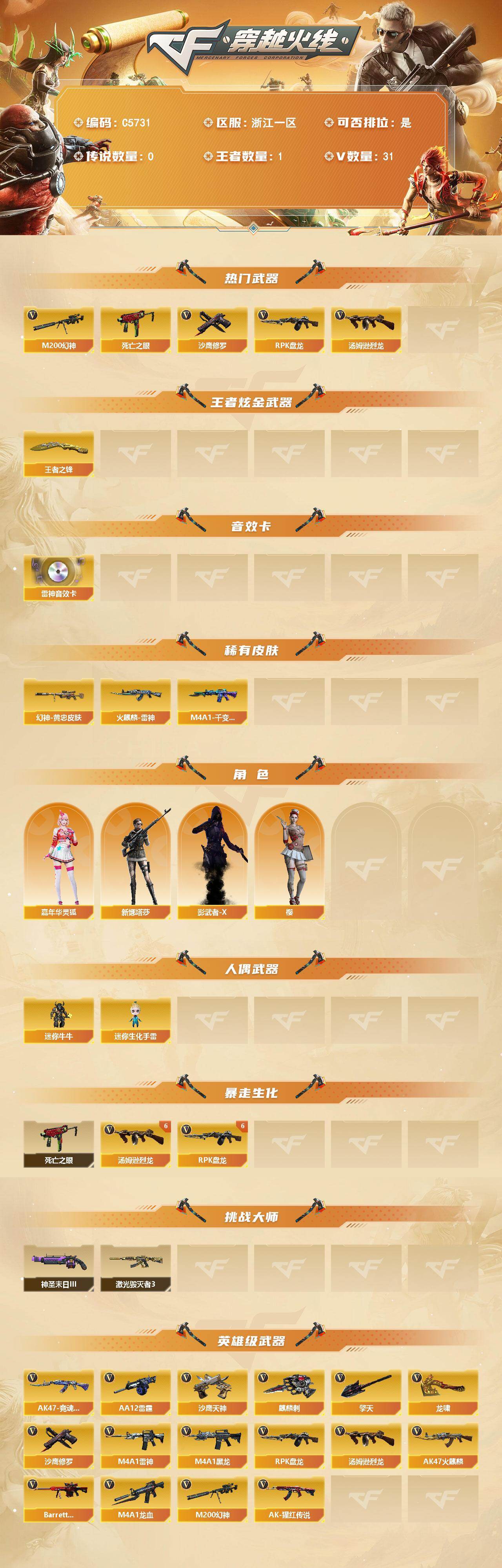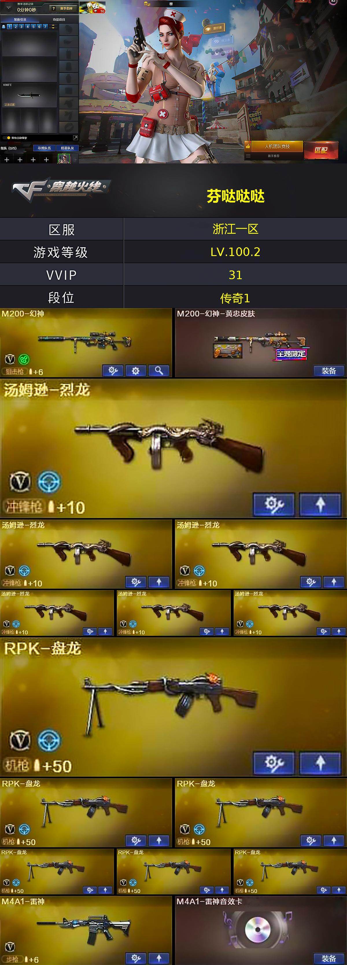 【572957】【572957】【C5731】浙江一区-31V-1王者武器数-0炫金武器数【热门武器】:M200-幻神,死亡之眼*2,汤姆逊-烈龙*6,RPK