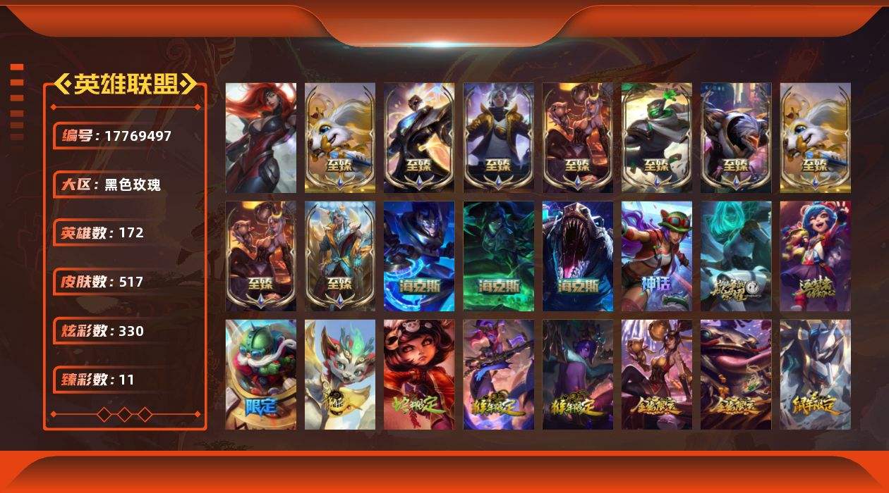 【573015】[17769497]【店主推荐捡漏号】白银段位-172英雄-517皮肤-330炫彩-1终极-16神话-71限定-51传说-119史诗【神话皮肤】:十周年纪念安妮,源代码乐芙兰,十五周年纪念希维尔,神凰行者瑞羽圣凰艾尼维亚,海克斯科技嘉文四世,海克斯科技雷克顿,摄魂使者薇恩,至臻征服者贾克斯,至臻真实伤害亚索,至臻天龙之子伊泽瑞尔,至臻烈焰美人薇恩,至臻烈焰美人薇恩2022,至臻绒