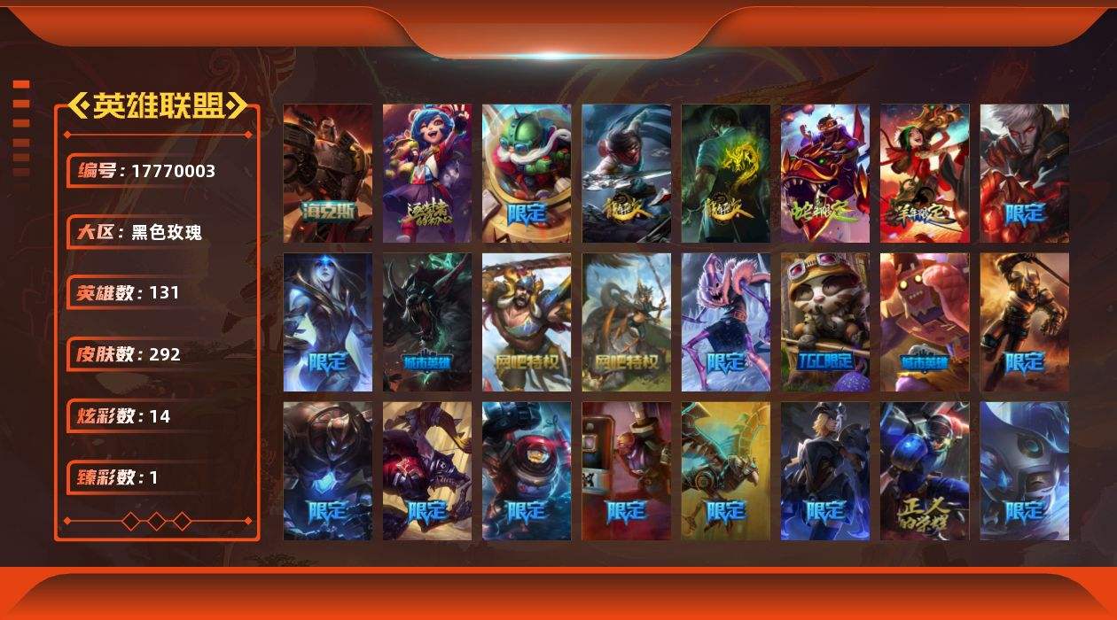 【573035】[17770003]【特价出售/店主推荐】未定级段位-131英雄-292皮肤-14炫彩-0终极-2神话-43限定-30传说-88史诗【神话皮肤】:十周年纪念安妮,恐惧新星德莱厄斯【臻彩皮肤】:偶像歌手阿狸极地雪莲【年限皮肤】:龙的传人李青,银龙裁决泰隆,神龙之翼库奇,神龙烈焰金克丝【海克斯皮肤】:恐惧新星德莱厄斯【冰雪限定】:圣诞精灵崔丝塔娜,圣诞狂欢基兰,阿木木“主人不要我了”